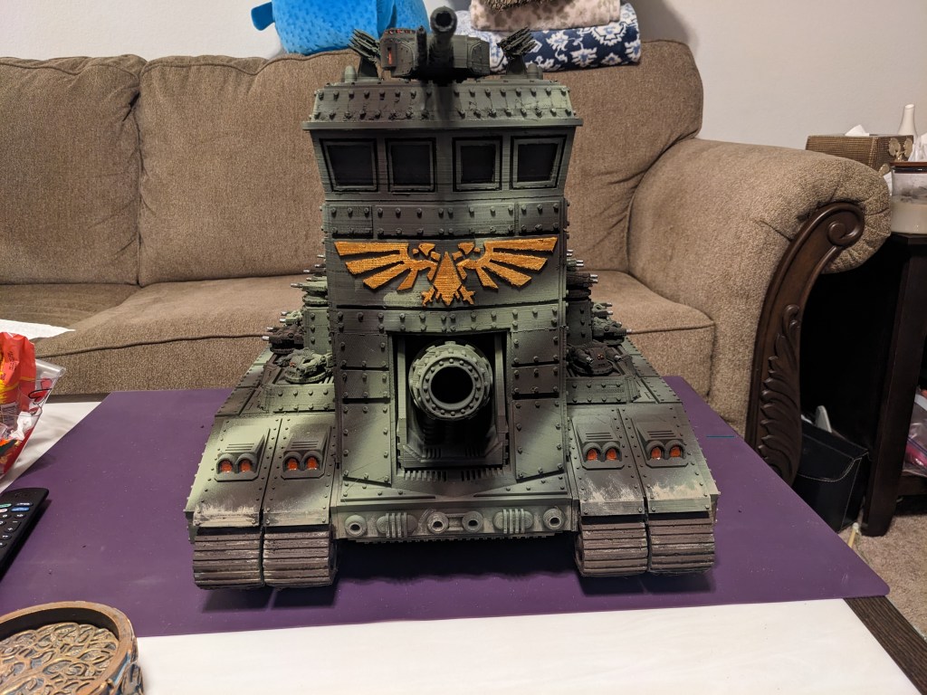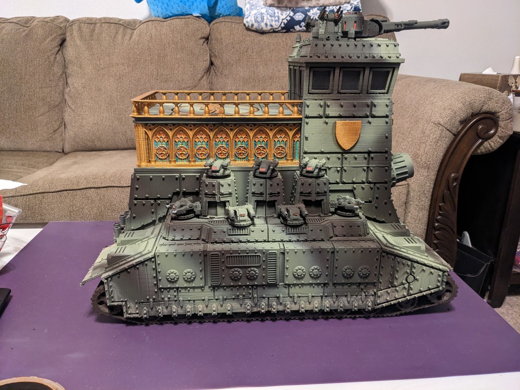 My former printing project, the Leviathan Regimental HQ by the same designer, is finally painted! I am not a great painter, and some printing techniques for massive models that I have learned since would help clear up some of the defects, but its still done! It looks awesome and really dominates the field. Check out these pics and let me know what you think!