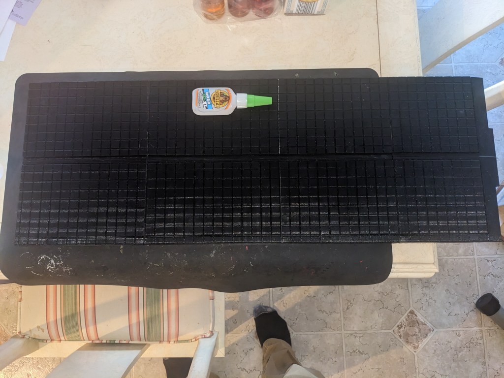 The left track as seen here with its final piece being glued on! This thing is so massive I had to use the wall to brace it up. After this picture was taken, I melted all of the seems together with a wood burner. I reached out to the creator of the file with concerns that glue alone would not hold its own under weight, especially if populated with models. He suggested the wood burner. I found that 315 F was good for a careful and slow progress. If outside and it is cool or the wind is blowing, it may require some increase. It is a slow and patient process, so do it in segments and do not rush it! I did find during this assembly I accidently got some curve going. It is very minor, but I was able to correct it with the right track.