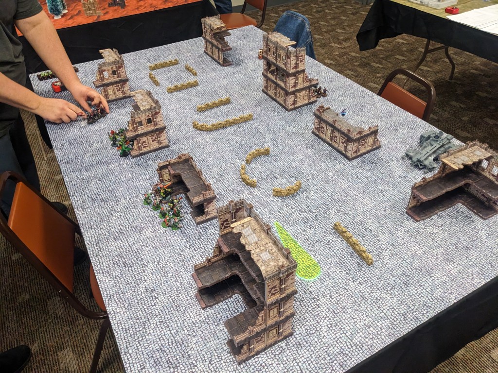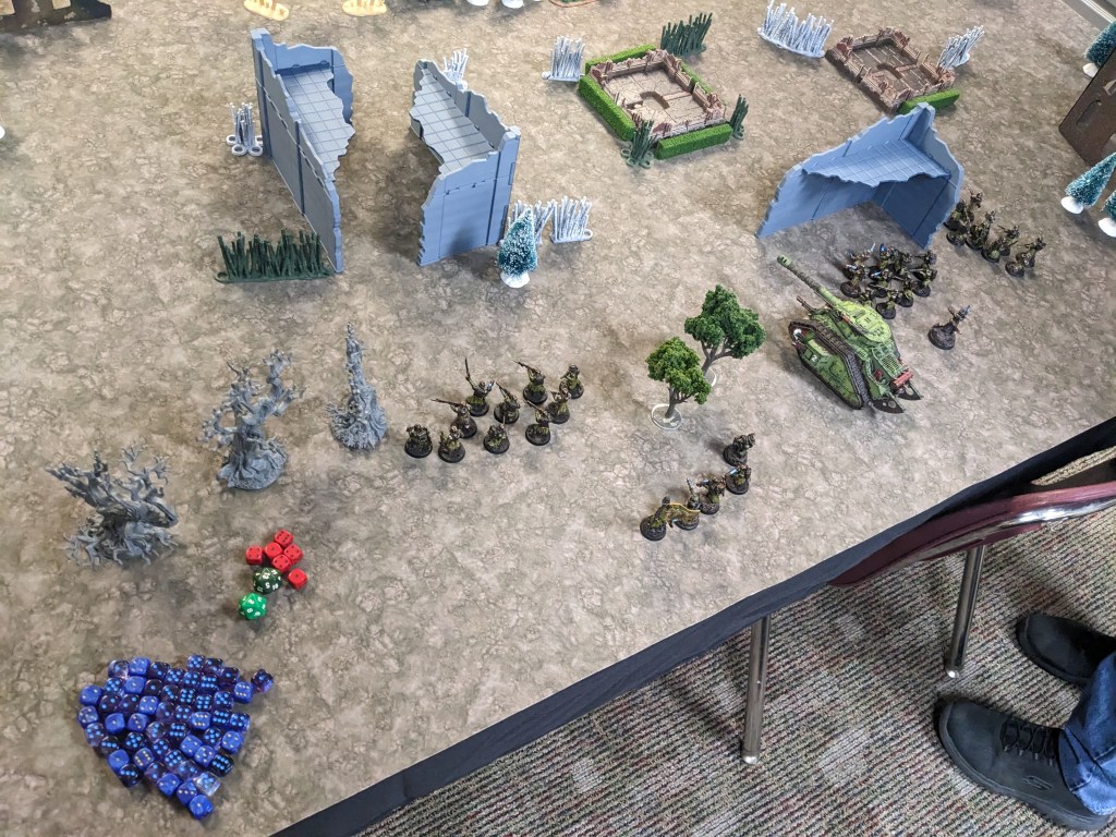 While the last two games mentioned were wrapping up, Max arrived! Quickly we took to the field doing some Imperial Guard vs Imperial Guard action. His Death Korp of Krieg brough their potent Mars Alpha Stygies Pattern Leman Russ Vanquisher!