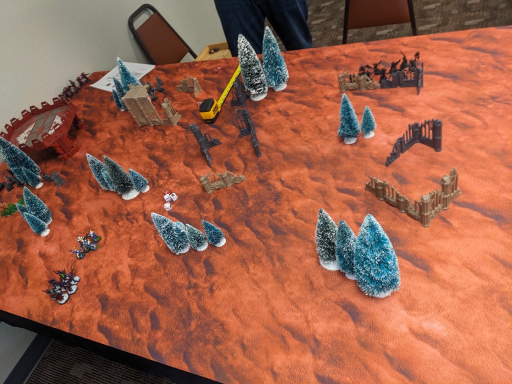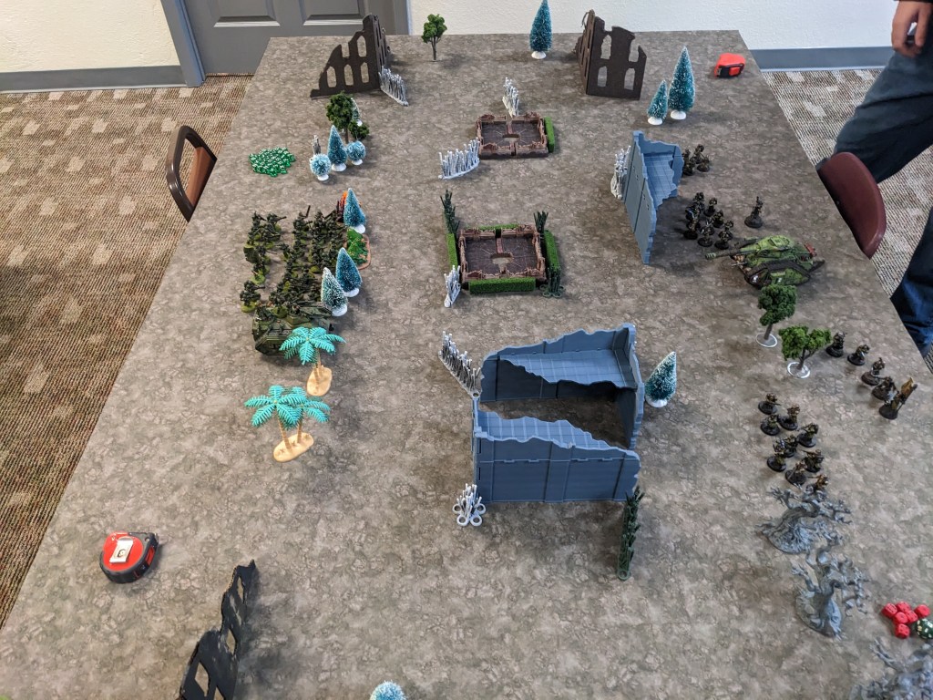 After those two games were done, we played The Doom. In this scenario, a wall of lethal force (such as intense radiation) is sweeping over the battlefield. Only problem is, you don’t know which one until after all deployment steps are done! It moves in at 12″ at the end of each Round.