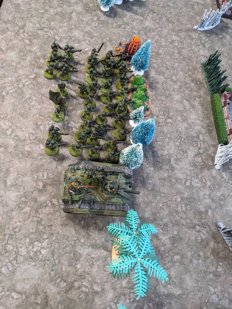 After having took a Plasma Pistol through the front, the Chimera was forced to decided where to put its front armor. I ultimately decided to put the front towards the Leman Russ to prevent Heavy Bolters tearing through the side with volume of fire. Afterall, the Sergeant’s pistol would eventually overheat, right?