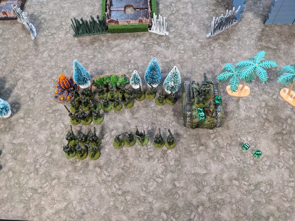 Blows were traded, and the Chimera then suffered a shell passing through the driver’s compartment. He survived, mostly, but the Chimera was moving rather slow. Quite annoyingly, his two guardsmen stubbornly refused to die from an awful lot of shots and prevented his push through the bamboo shoots.