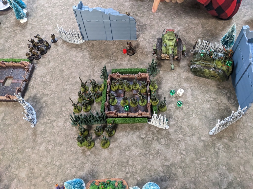 I fired Krak and Hunter Killer Missiles, getting a penetration. Minor damage ensued. The Krieg Veterans were cut down by point blank lasgun fire, leaving the Lord Commissar with just one Wound!