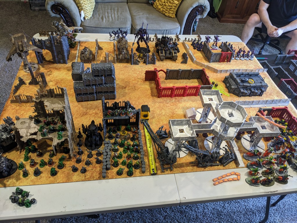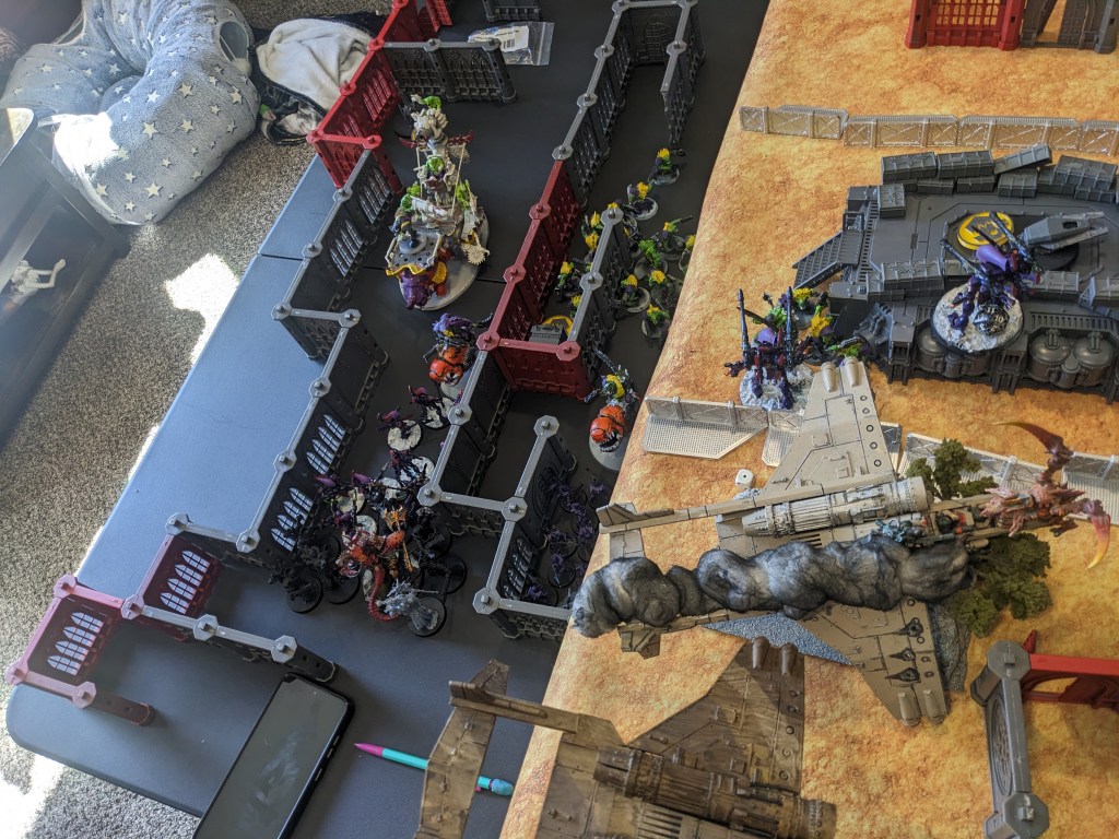 We deployed with Eldar vying for control of the basement and supporting the rear objective. We were testing the rework of Eldrad and Wraith units today, and Alex was running Iyanden Craftworld, meaning that his Wraith units gained Objective Secured. Supporting them were two units of five Swooping Hawks (also being reworked like everything in their Codex) and two units of Defenders.