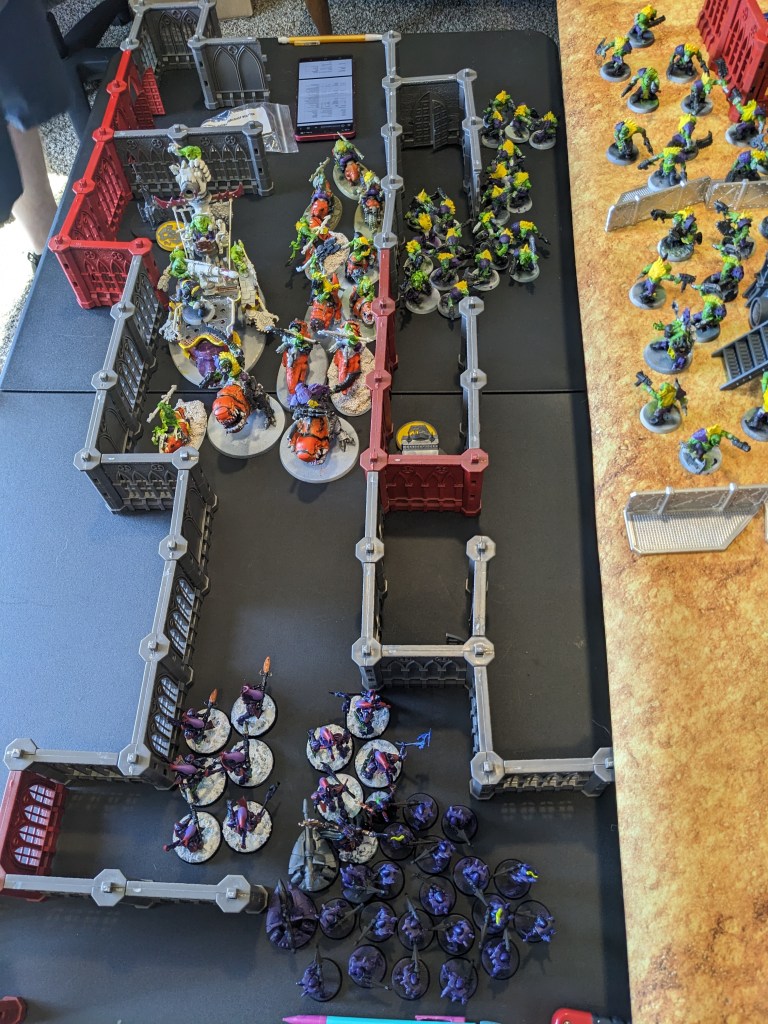 As such, the Orks hit fairly hard without about 600 points of light cavalry and two bosses. The managed to do minimal damage and lost some light cavalry. Unfortunately, the Kill Rig had to wait for everyone to die to get involved or this could have gone differently early game.