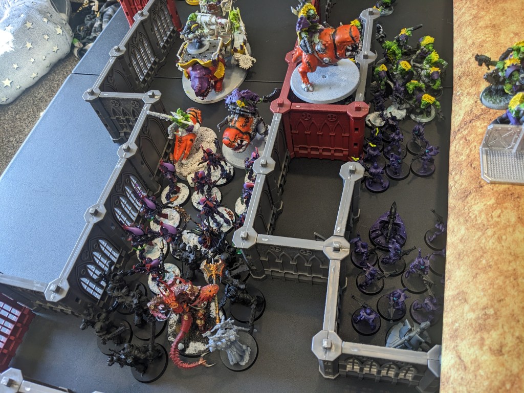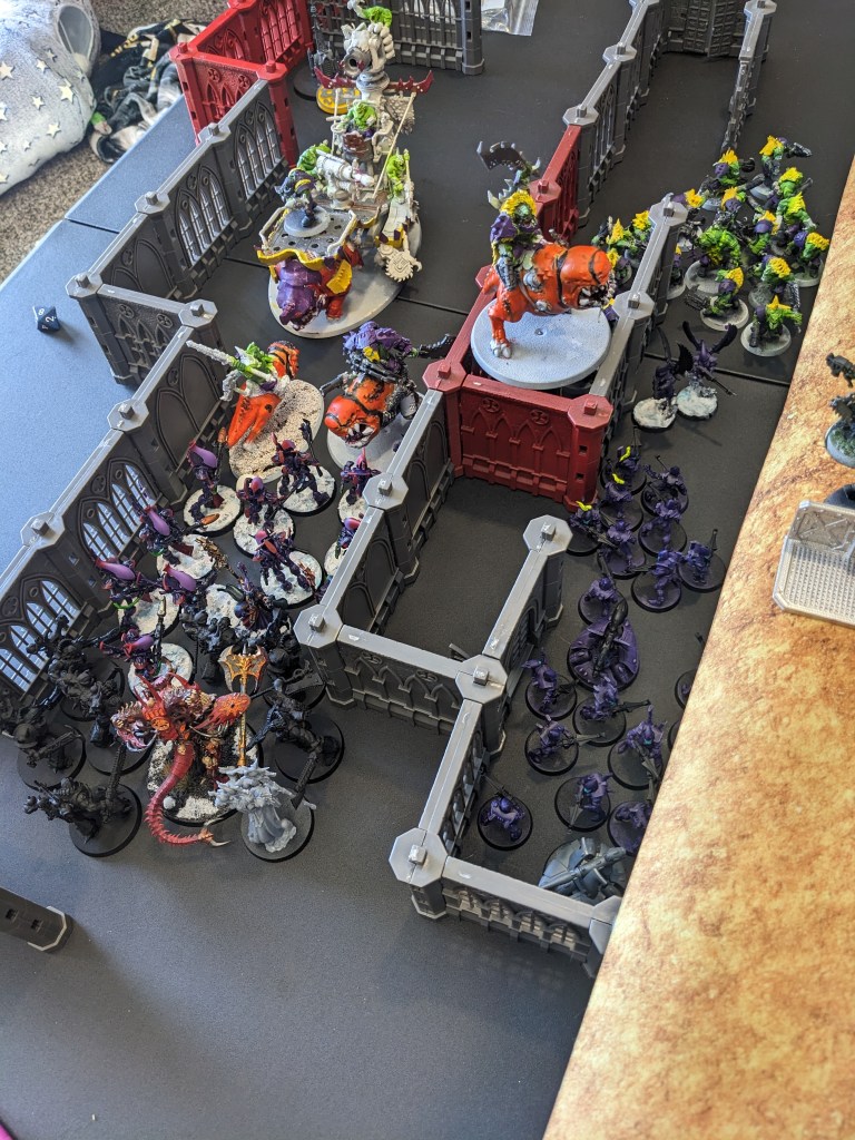 The subsequent shooting and Charges did not end well for them. One of the Warbosses had fallen back and then rallied. He came through the wall like a green Kool Aid man (technically Infantry and Steed, not a Monster). Ducking his head (and avoiding the Dangerous Terrain Test), he joined in the fun!