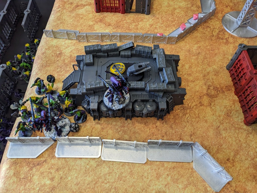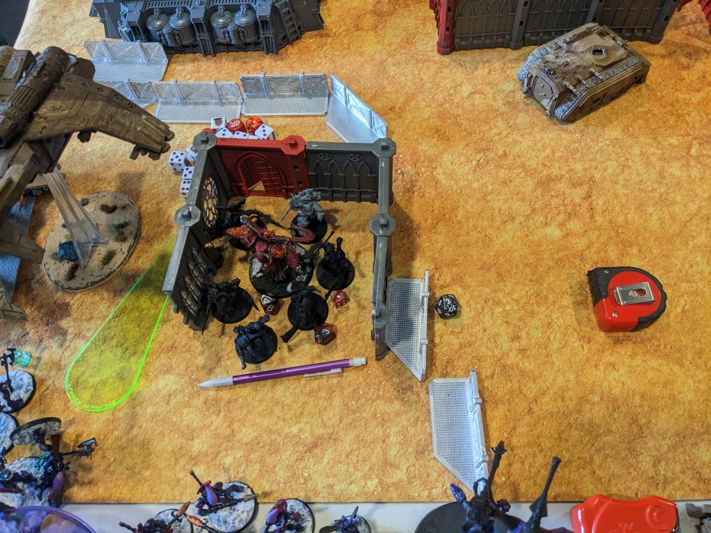 Eldar Defenders moved into grab the objective on their side. They could get close enough, so a unit of Swooping Hawks Deepstriked on top of it. Well kind of. They went off course and splattered into the wall, but it was enough to claim us 2 VP! Now you may be asking how one Deepstrikes from the sky underground. No idea. Webway gate shenanigans. The game wasn’t written with multi-level in mind.