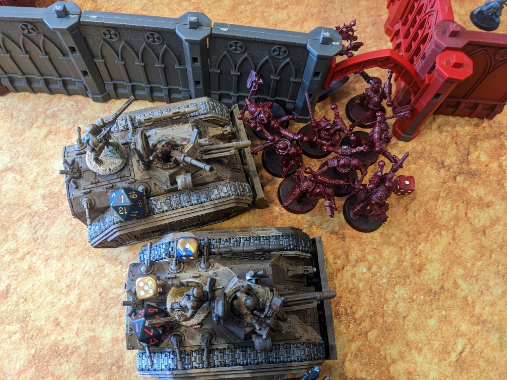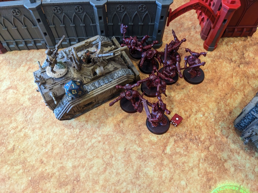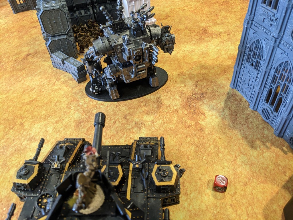 The Naut failed its charge, but crippled the Chimera’s engine! As the Steel Legion pulled back and formed a wall of, well, steel, it was forced to break off and do its best to get to safety by driving through some ruins. All Hunter Killer Missiles fired at the lead Naut. Everyone rolled a 2 or 3 To Hit. The Fortress of Arrogance could work with this thanks to its elite commissariat crew, but the energy shields of the Naut shrugged the blow! The Mega Battle Cannon and Demolisher Cannon were less forgiving. Both them and one of the Lascannons got through. In turn they crippled some secondary weapons and its engine as well!