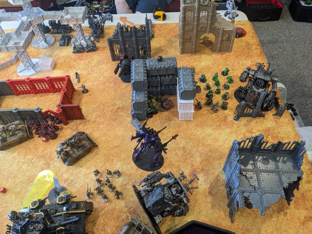 The Eldar Wraith Knight lended some fire power as well, but the pilot spent all game trying to figure out how its multi blast weapon worked and shot up just about everything it wasn’t aiming at.
