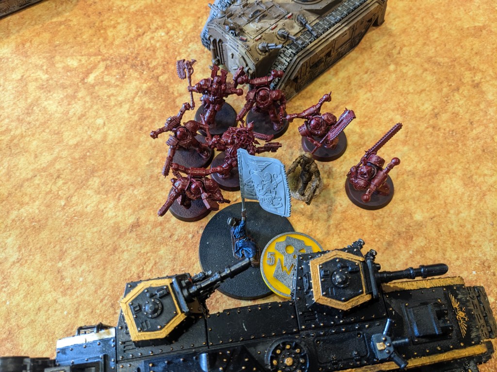 While distracted by the Orks, the Berserkers failed their Ld save for The Nails Bite. Despite intending to be held in reserve, they charged the Chimera, lightly damaged it, and then chased it 1.5 inches. One Wound remained, but it killed one in return.