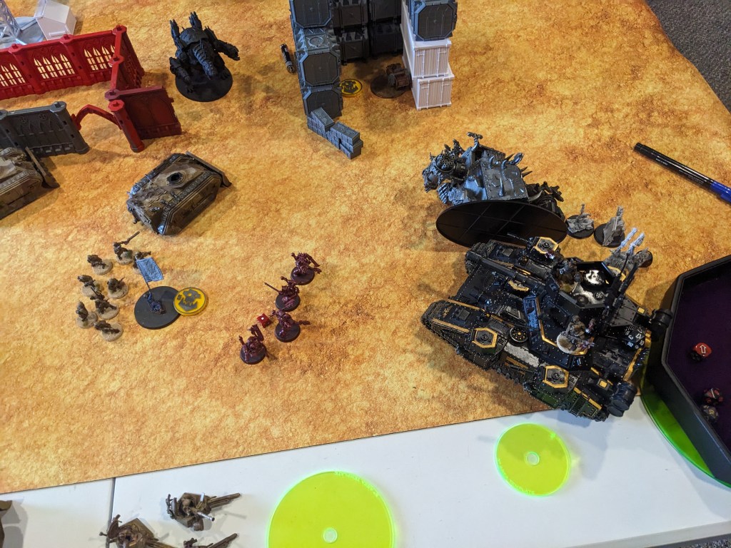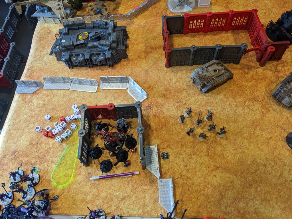 Meanwhile, the Berserkers were in a great spot. They had two separate objectives needing them to hold #5. They instead once again failed The Nails Bites and had to charge the Baneblade instead. They proceeded to do 1 damage to it and miss out on 2 VP.