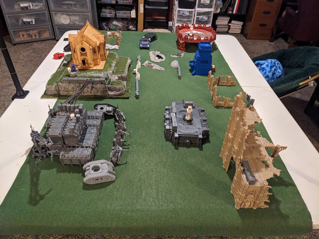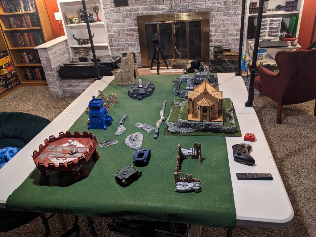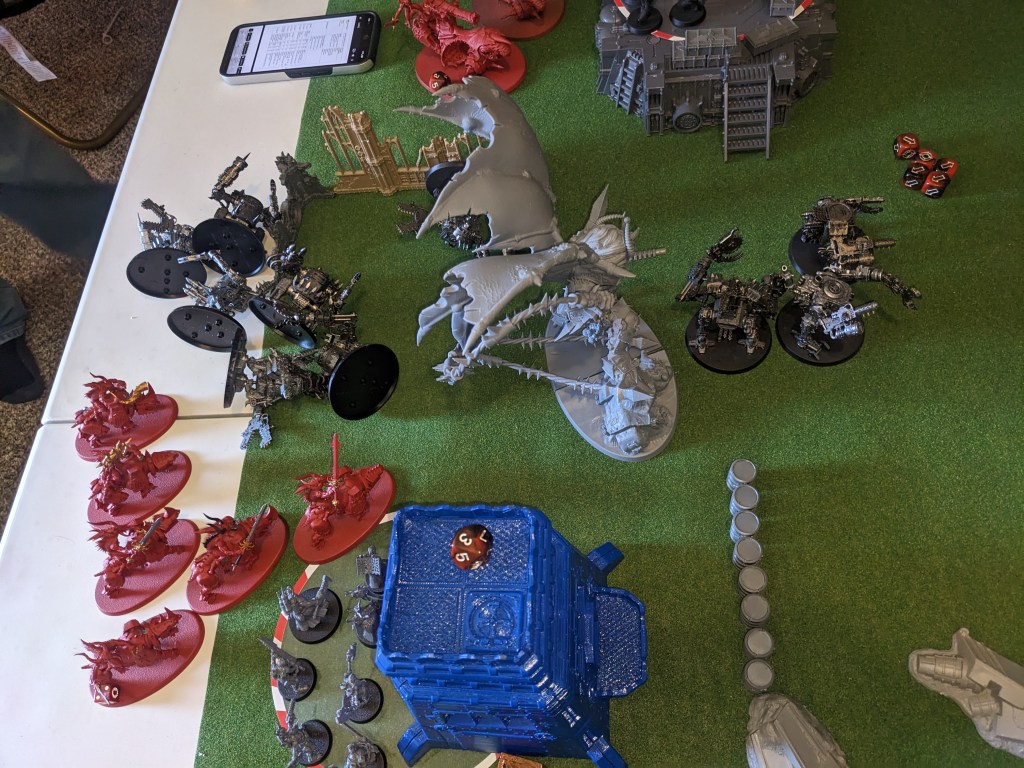 I didn’t get everyone’s deployment picture. I got too excited! Orks deployed Meganobz with 4 characters in the fortified line, a group of Ork boyz in by the statue, and another on the left flank we planned on pushing hard as possible while the middle and right held firm. A full unit of ten Killa Kanz deployed near the middle.