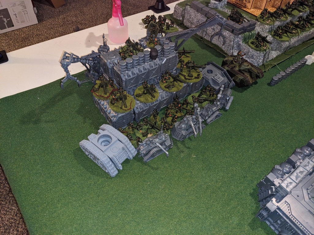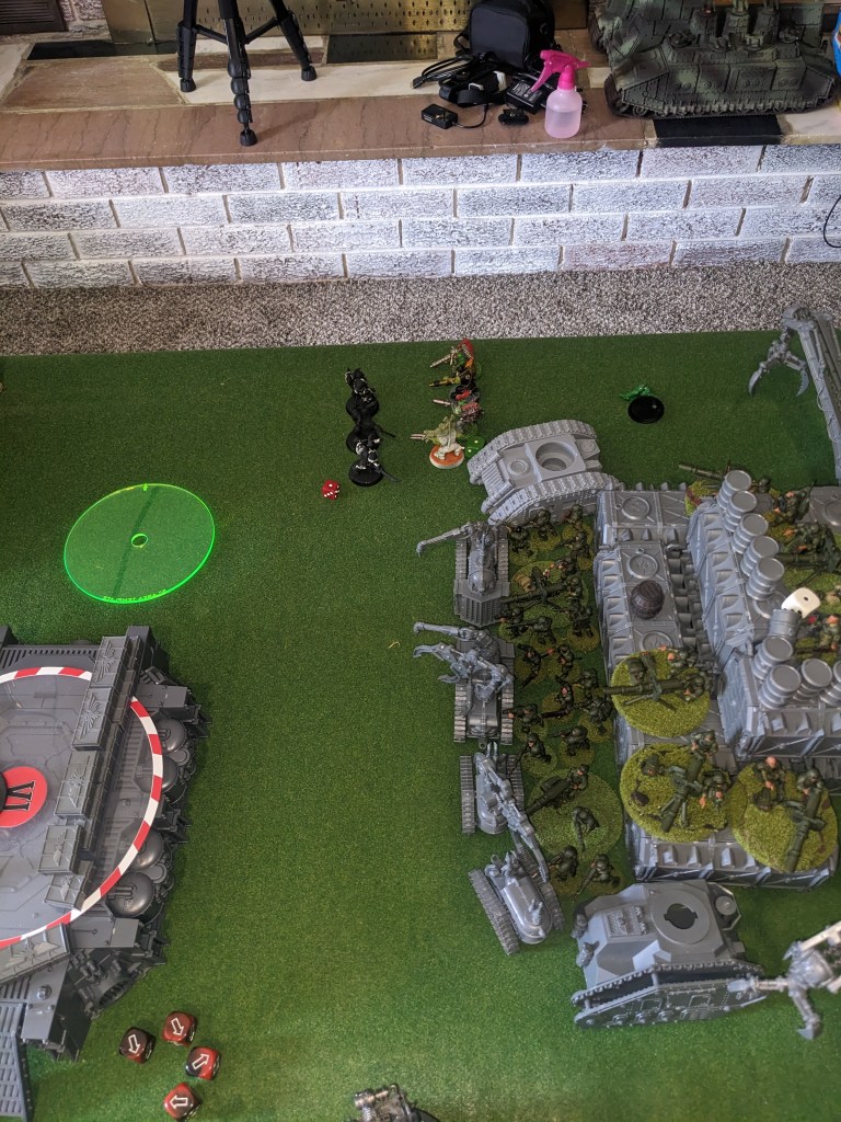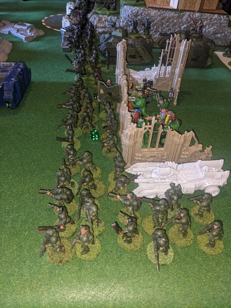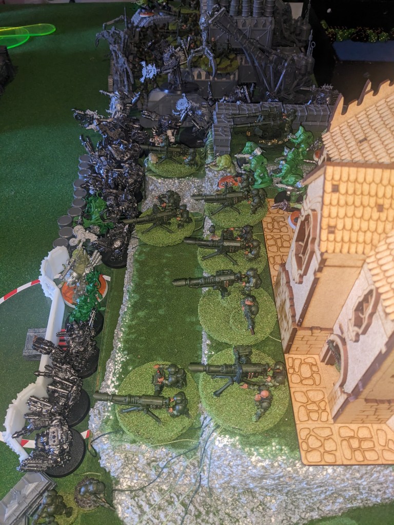 While the filthy greenskins were hammering away and yelling “Waaah” or whatever it is they do in their past time, us Imperial Guardsmen were coordinating fire on the biggest demon we had ever seen! Heavy Weapons Platoon Bravo is a dedicated tank hunting platoon, meaning we brought 18 Lascannons to the field amongst our units. Combined with the crude Ork weapons, we nearly got him in the first volley!