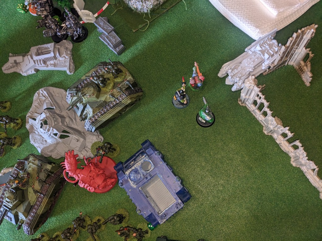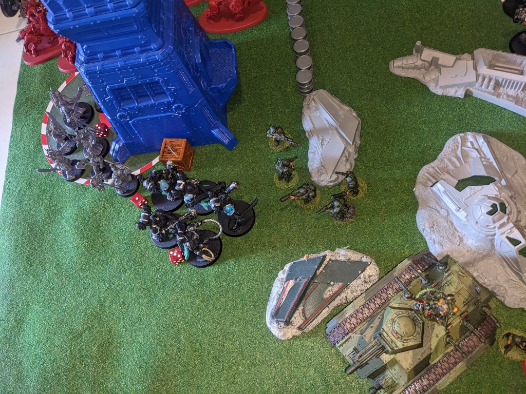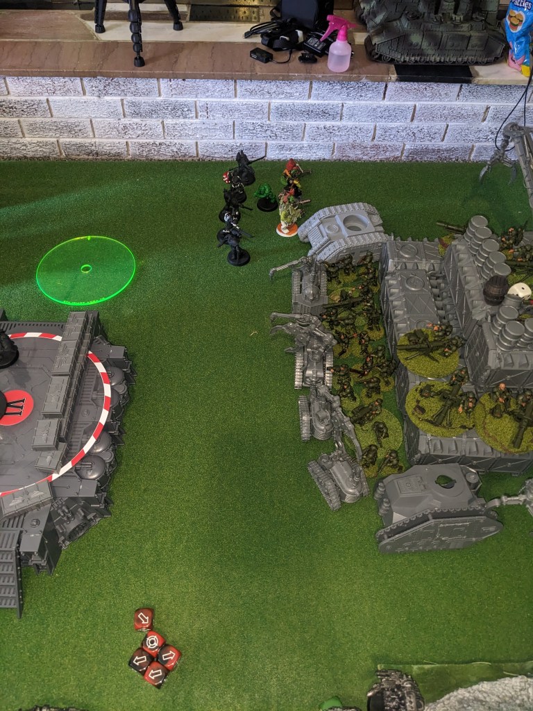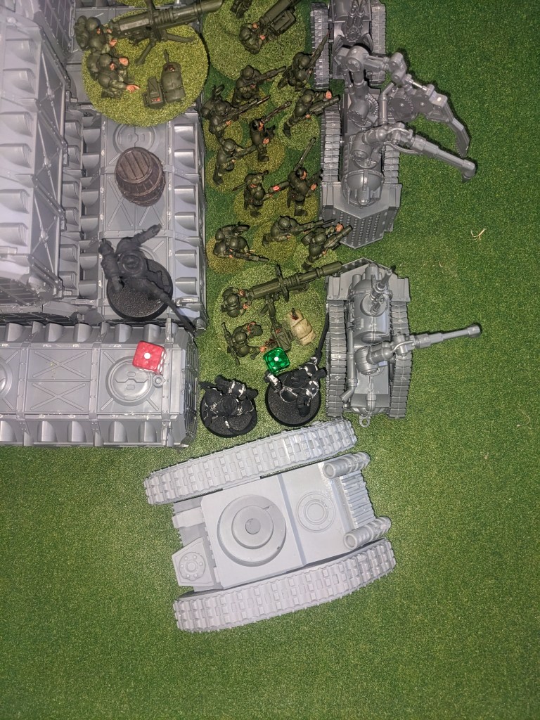The flanking assault had been brutal, but we made it to close range! A heavily injured squad was still on point, moving up, they doused them with burning promethium, a frag, and las fire, but had little effect. Chimera fire support was able to help get some damage on the squad, but their Lord Exultant soaked it up.