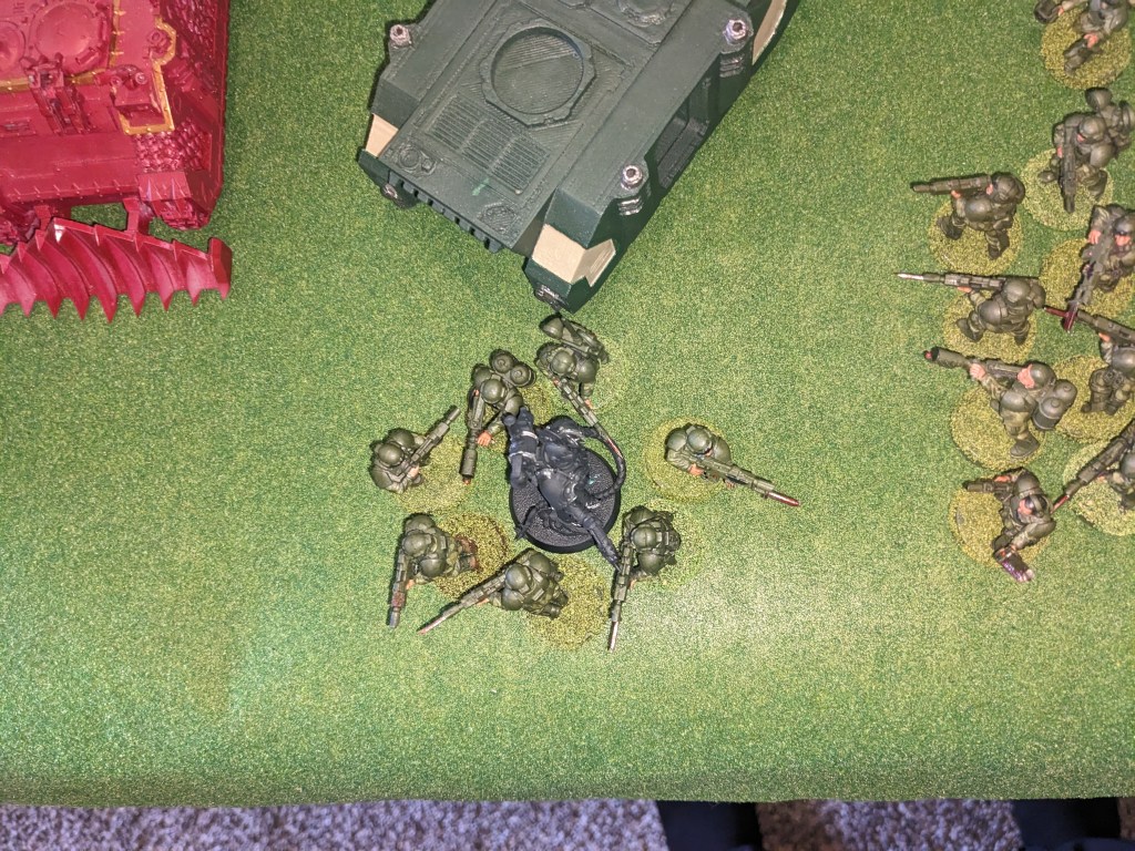Getting right on top of them, a flamer maneuvered around the Rhino and flamed the squad while his sarge fragged them. Sporadic las fire saw them reduce the squad to cinders and nearly kill both of their daemonic leaders! One of them looked like he had plot armour. Skulltaker or whatever they called him. More like Beatingtaker if you ask the guardsmen!