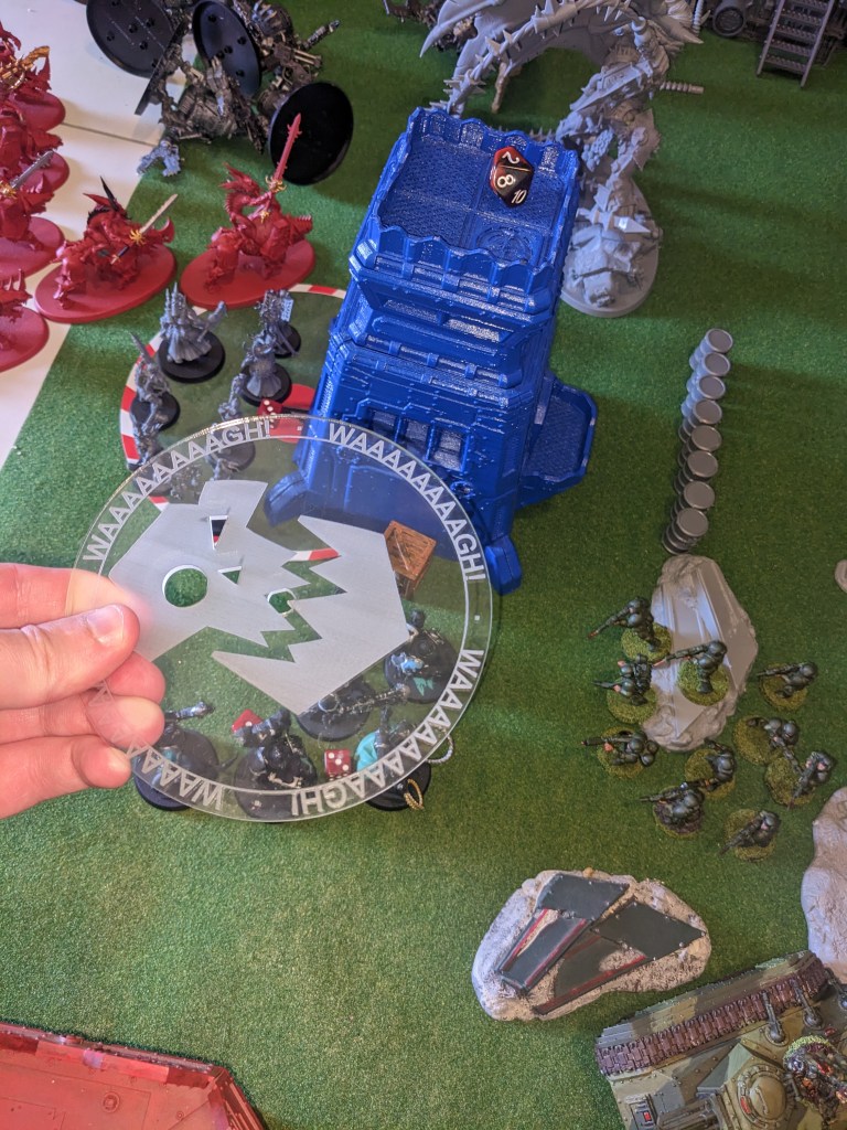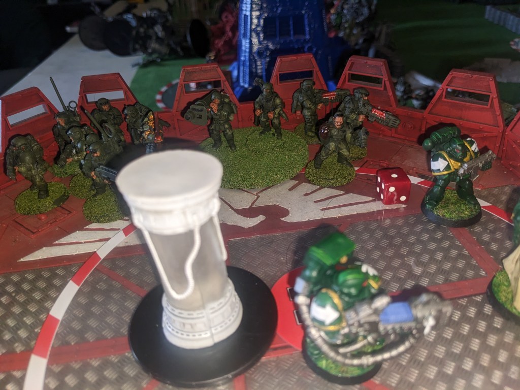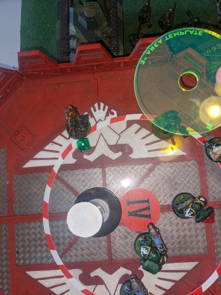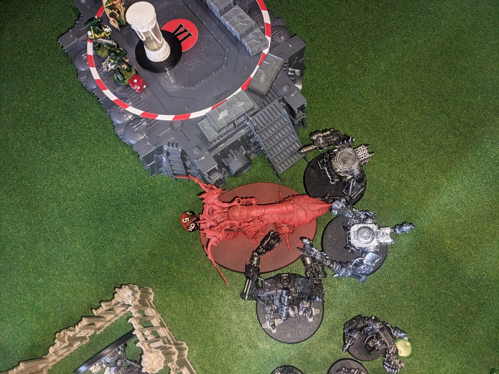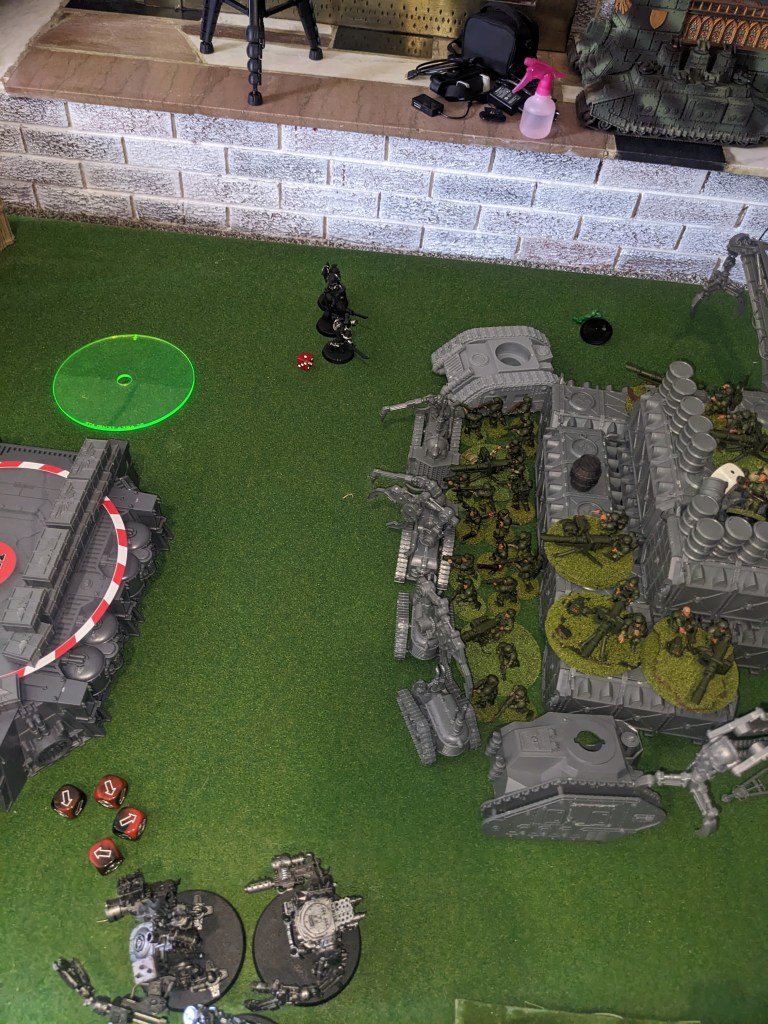 With their Chaos gods screaming for “The blood of at least one of the Warlords you incompetent fools!”, they fired their last Skull Cannon from across the field. The tower perfectly hid the injured Lord Commissar from view, so the hope was that the wind would blow the round in the right direction. A rivet would help it ricochet, or Nurgle would produce powerful flatulence. Anything, but instead it blew up against the armoured panel, failing to even wound the Sergeant!