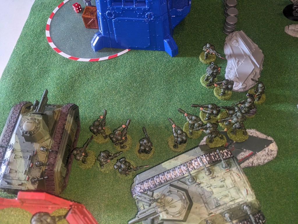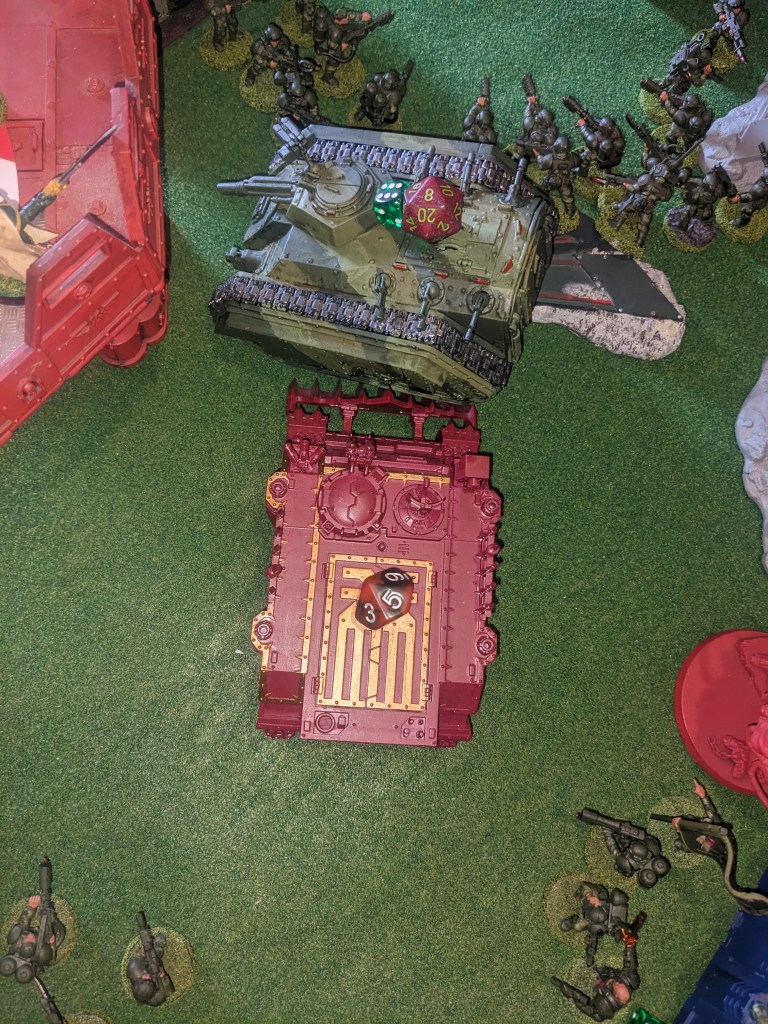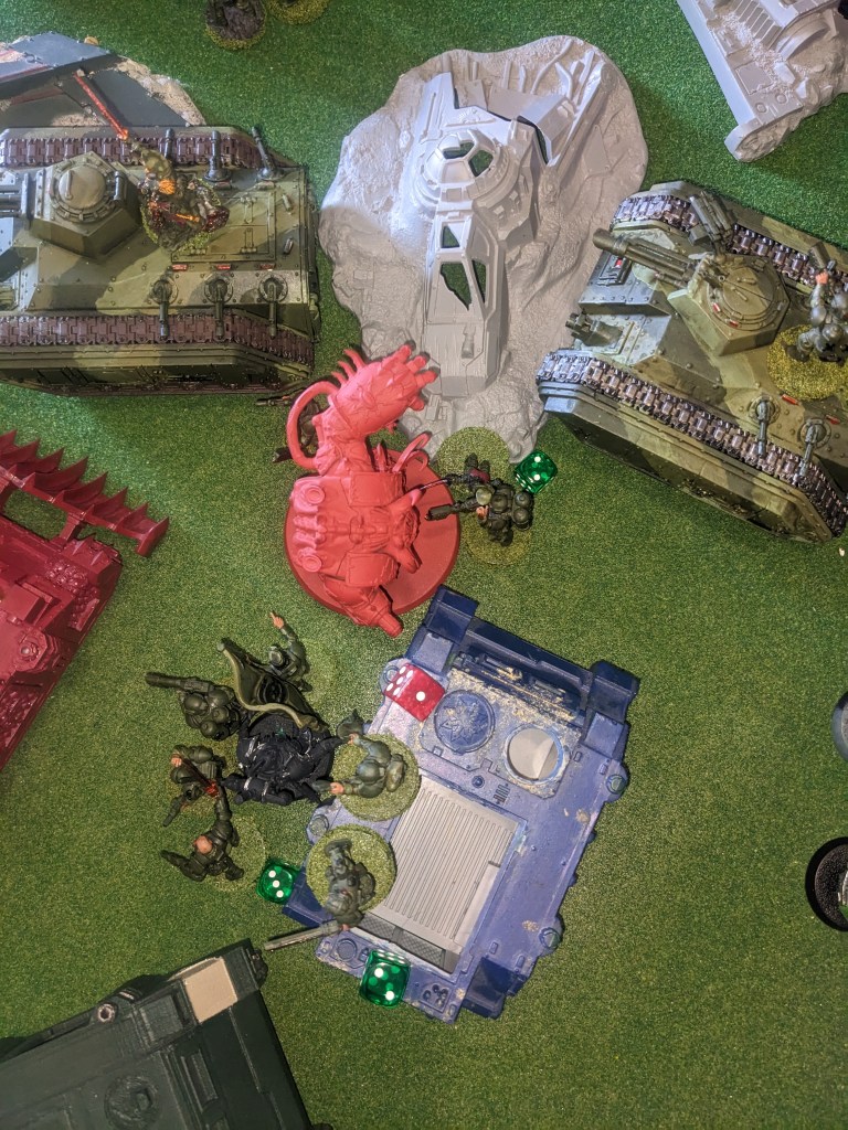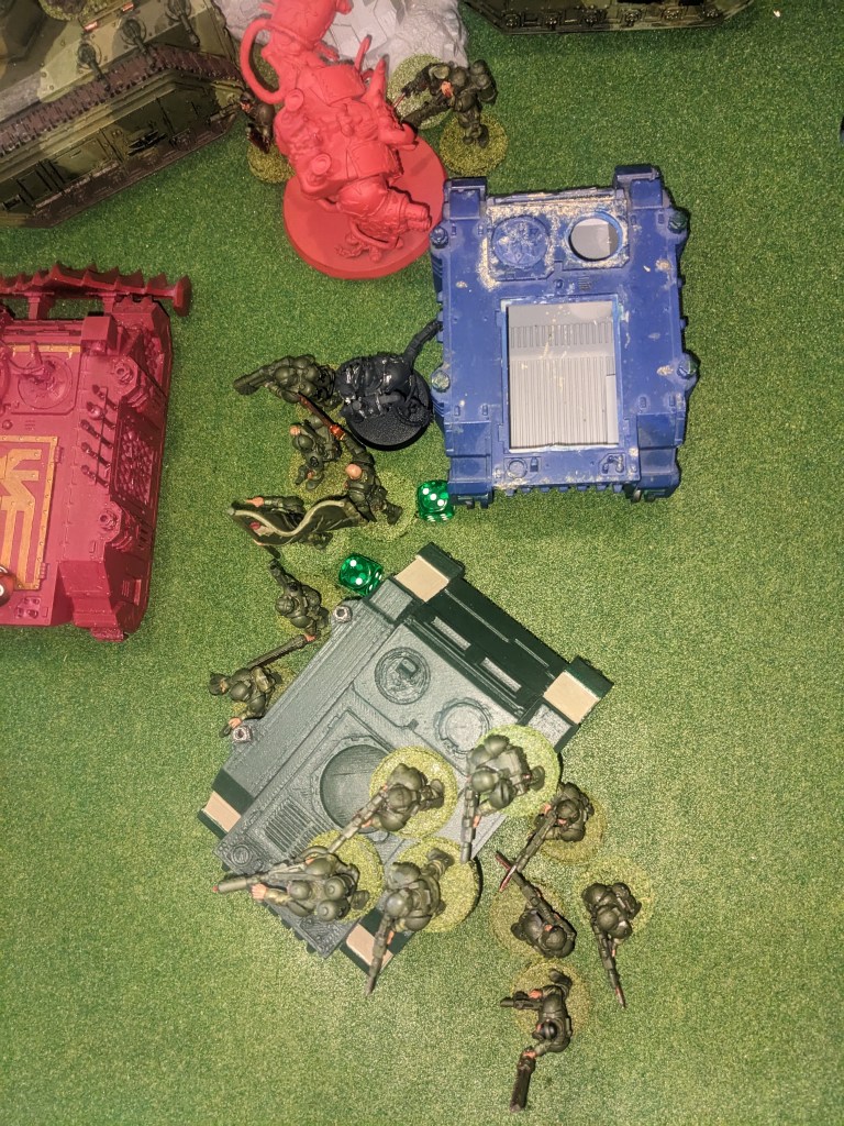 While Chaos was distracted by the steady barrage of fire, Assault Platoon Alpha moved up in force! With a borrowed Chimera from the Heavy Weapon Platoon, they moved up providing supporting fire from both Chimeras, taking their time as the infantry pushed hard. Las fire poured in mass, slowly picking of the chaos marine screen. A lucky burst from the Multilaser punched a hole in the engine block of the Chaos Rhino, ensuring it was not going to be going anywhere unexpected.