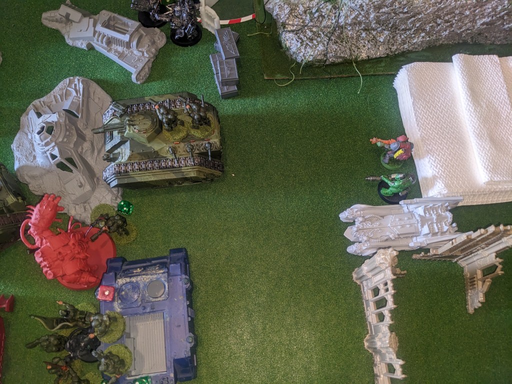 The Commissar was slain. After having endured five rounds of Melee with the Hellbrute, her and her squad’s sacrifice had paid off. The entire flanking maneuver had pulled off. Not only had they secured the flank, they swept forward and wiped out half of the middle as well, letting the Mega Nobz push forward and seize the field!