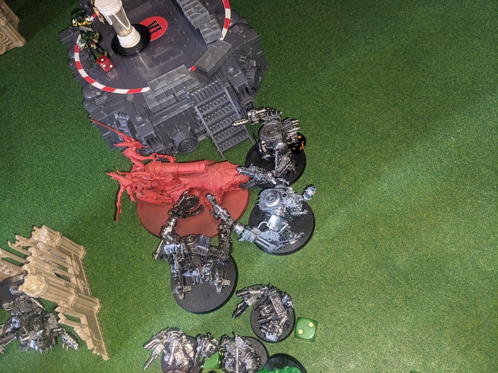 The Hellbrute was not going to miss out on the fun! After barbequing five guardsmen, he stomped in and started smashing one of the units. It completely whiffed, tripping face first on the wreckage and did no damage! They held the line, keeping it busy so the others could push forward and overwhelm the distracted Noise Marines.