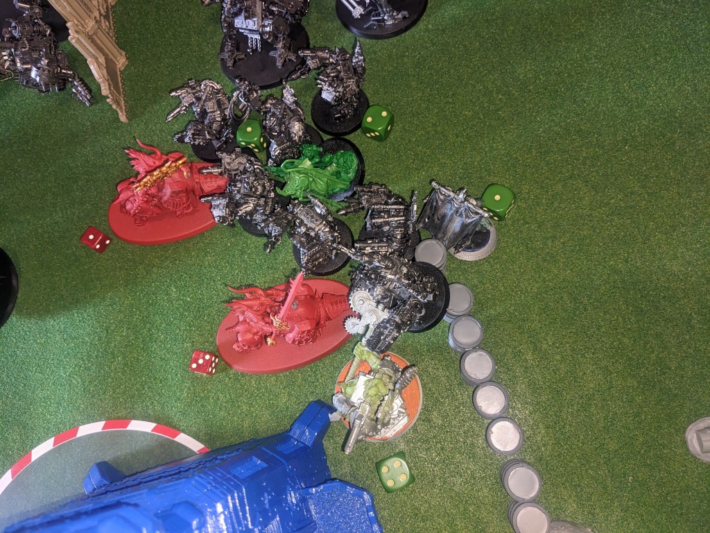 At this point, Lascannon fire was being sent into Noise Marines as there was not any good targets, and the marines were taking a toll on the Mega Nobz.