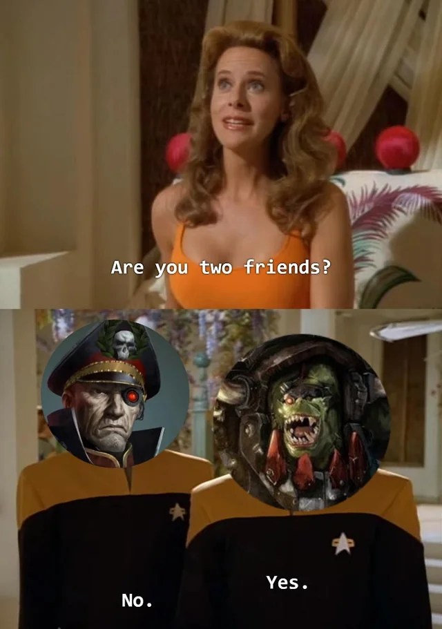 Lord Inquisitor: *sighs and rubs eyes tiredly. While he is distracted, the Lord Commissar gives the Warboss a wink.*