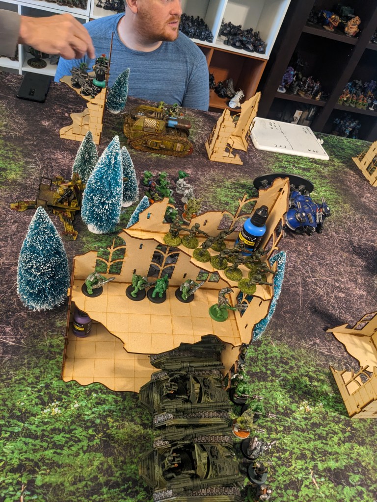The Ratlings picked off another cultist. Nurgle’s rule this day was that a unit could never kill more than once Cultist at a time it seemed. The Orks continued the grind against the Triarch Stalkers, but now that Charr had the Kill Saw going was struggling to use it correctly. A patient Ork had to stop and help him learn to swing it spiny sharp end at the enemy even though it was less exciting to not get to see the sharp spiny side of it. A Triarch stalker was damaged, but they killed a few more Orks.