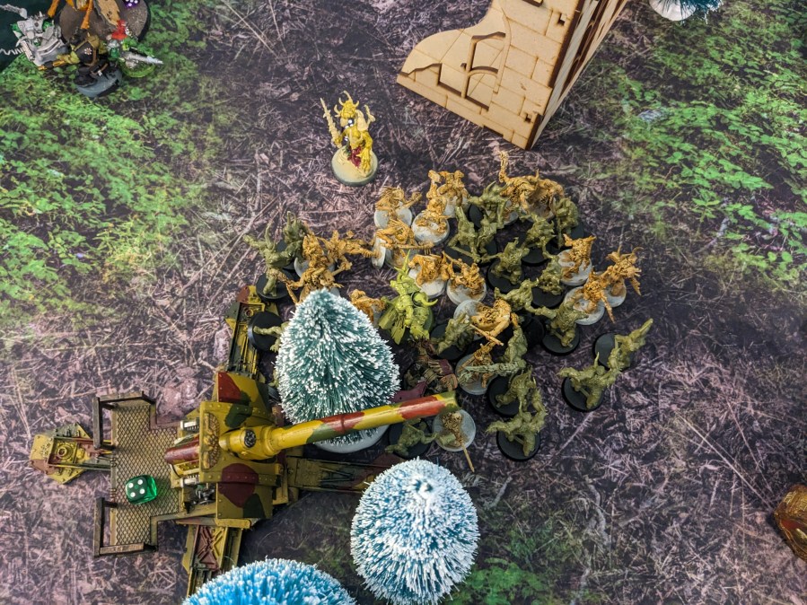 The Ratlings killed the Pox Rider that survived the Ork Kommandos. The Earthshaker Platform was completely surrounded by this point. Firing point blank into the crowd, it sent waves of them into the air moments before the crew detonated the ammunition cache and took many more out with them. Most of the flying zombies survived, but still lost significant numbers despite their durability.