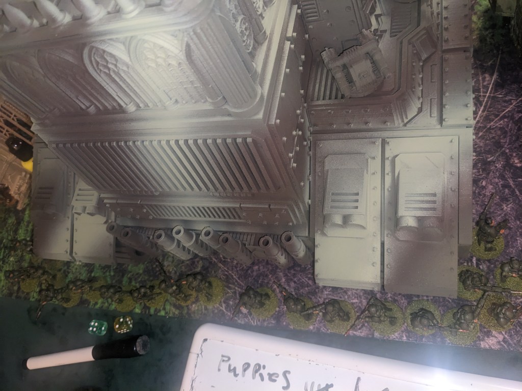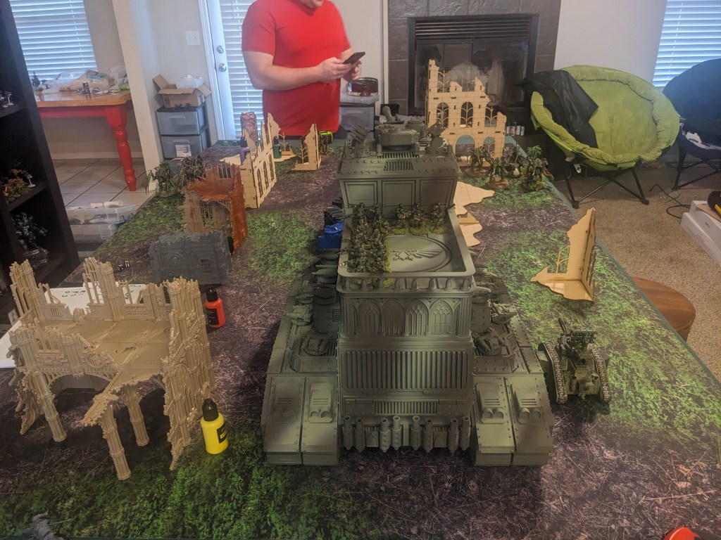 Pask Deployed the Leviathan in the middle, where the Attrition style deployment allowed it room for distance and to rack incoming enemy with its many secondary weapons. Two units of volunteer Veterans operated the back of the tank on its fighting deck for security purposes while Pask deployed on its right for observation and assisting fire support in his Punisher Leman Russ.