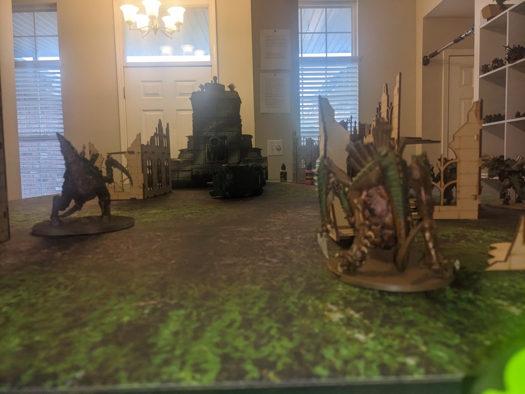 The Carnifexes came in closer, but still out of reach of smashing the warmachine to pieces. More Gaunts rained from above, the fleet action not slated to take it out in time for this to resolve itself. Based off of the few numbers, it was not an immediate threat.