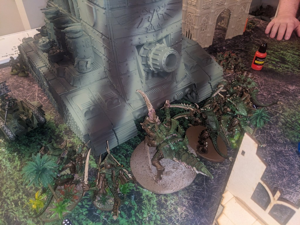 Knight Commander Pask personally was over seeing the test. As the foremost expert in Imperial Guard Armoured Cavalry, he was determined to be the leading expert in assessing the command tank’s status and capabilities. A large basin was selected to contain any nuclear blast if the reactor went critical and the Tyranids moved while sedated. The Tyranids were staged in two main assault groups. The Swarmlord was placed with the Stonecrusher Carnifexes, and Old One Eye was placed with a unit of standard Carnifexes. A Scythed Hierodule accompanied the Stonecrushers by proximity and some lesser life forms with a Tervigon held the back line.