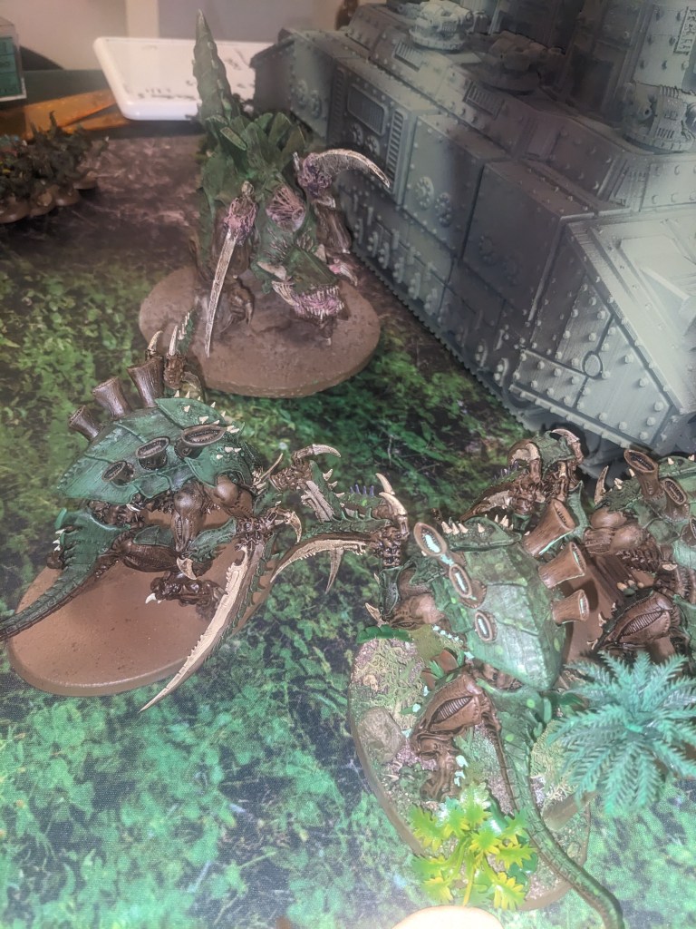 The left side of the Leviathan was not quiet either. Four Heavy Bolters poured fire into the Hormagaunts that fell into their kill arc. Another two Heavy Bolters, six Lascannons, and two antiair missiles fired at the Carnifexes, injuring one severely.