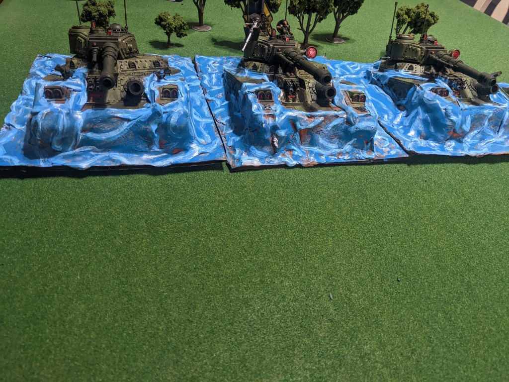 The Dark Angels had retreated from the Tyranid horde after failing to stop them. Crippled, the horde took up residency in the ruined cathedral. The Cadian Shock rolled up their recon unit to demolish the desecrated shrine and avenge the fallen. A squadron of three Baneblades rolled up out of the river in a deafening rumble and crashing waves. Their sponson weapons and turrets had been replaced by additional armour plating, making them harder to flank effectively. The Command Baneblade lead the assault with its company banner billowing in the wind. Three intense spotlights lit up the cathedral, their intended target. The Imperium only deals in absolute firepower, and the Imperial Guard was ready to bring its most powerful formation to do so. Each Baneblade had a squad of Veterans with antitank weaponry. The Lord Commissar coordinated the assault from the Command Baneblade.
