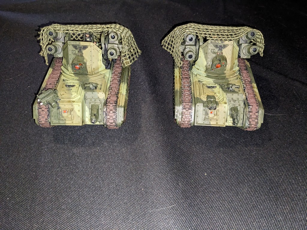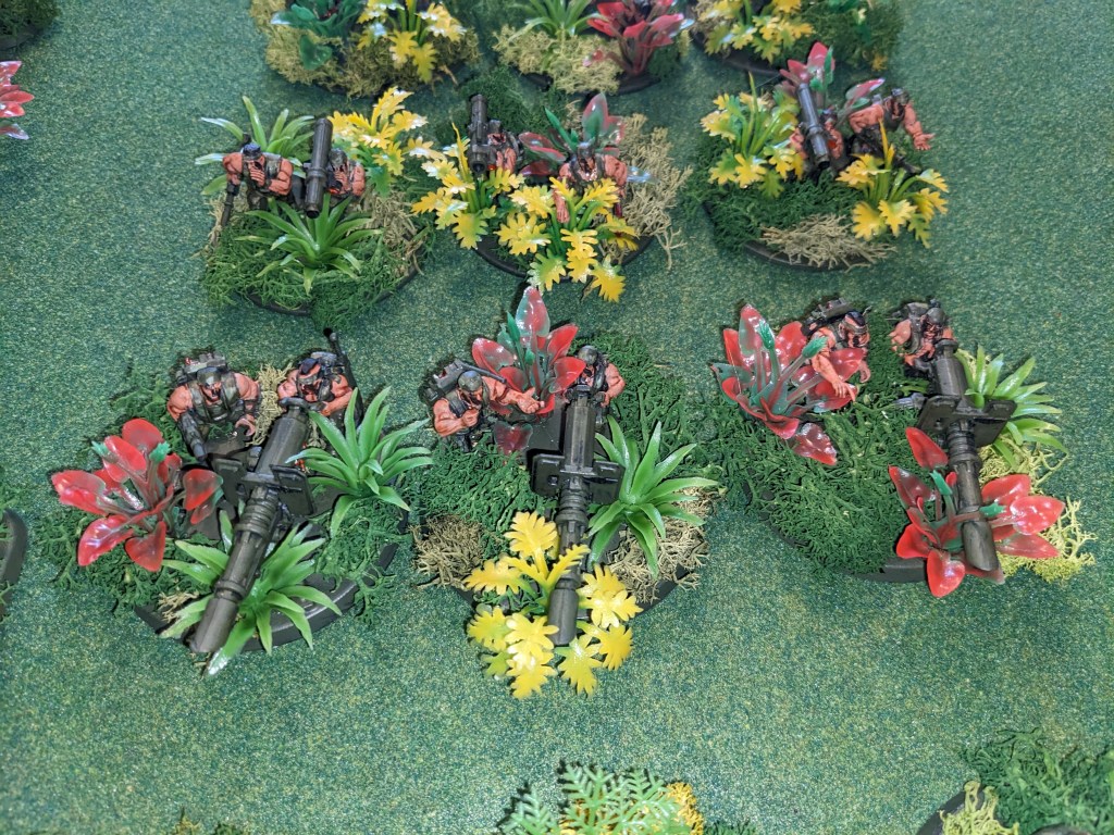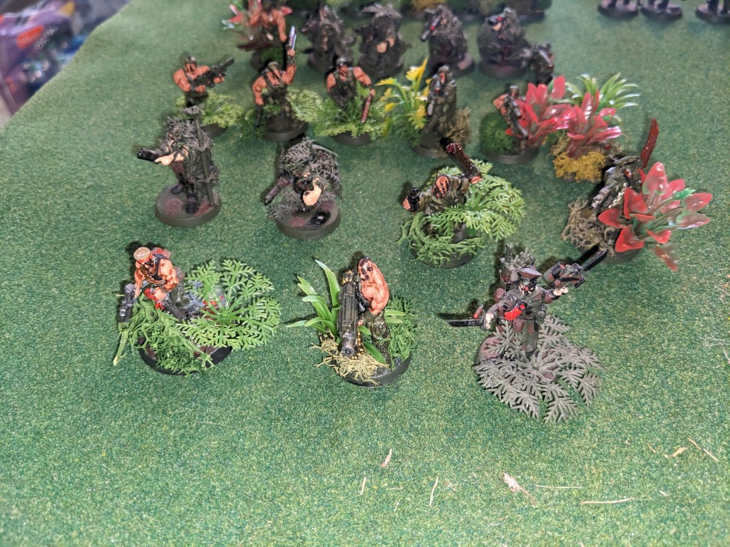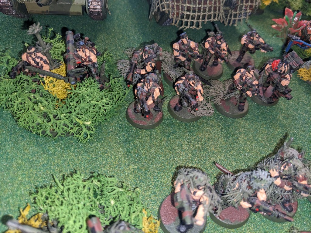 Catacha is clearly populated with Arnold Schwarzenegger’s looking for predators in the jungle. I went with the striped camo face pattern like in many 80’s action movies, ignoring their bulging biceps no doubt giving them away. For Catacha I prioritized close quarter weapons that ignore cover or make swiss cheese out of everything. They share similar camo pattern to that of my Cadians, but I feel from the lore they focus more on stealth so I equipped all of their vehicles with camo netting. While the Hellhammer cannot actually equip it, I felt it was more appropriate to keep with army appearances.