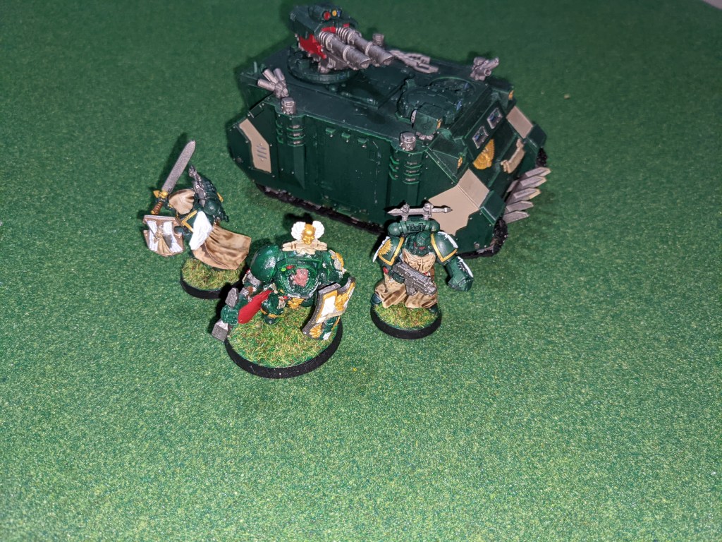 Mortarion landed with a thunderous crash behind the Veterans in their ruins. After laying multiple psychic powers into them, boosting himself, and then also melting his brain a little, he charged in and obliterated them with his mighty weapon. His incredibly powerful pistol shot skimmed off of the lightly armoured Razorback, making an excellent propaganda film moment about imperial armour superiority. The Deathshroud came up to the trench line, intent on smashing the Lychguard to pieces. Much to everyone’s surprise, including the Lychguard, the Deathshroud Terminator’s Manreapers were very slow to wield, and they were able to slay four of the Terminators before having just as many of their own knocked down. Most of them stood up, and the Deathshrouds became outnumbered significantly. The scribe quickly scribbled this down.