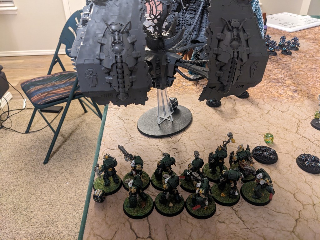 They finished their initial assault by smashing into the Tesseract Vault! It put up a valiant effort and injured the Chaplain, but its Overwatch fire was completely blocked by the Chapter Master. Thunderhammers rained down on its hull, buckling armoured plates or sending them pin wheeling through the air. The Chaplain had a Power Fist and proceeded to beat it like a drum despite not having the power of a hammer! The Vault still hovered after the initial assault, but its engines and sponson weapons were crippled.