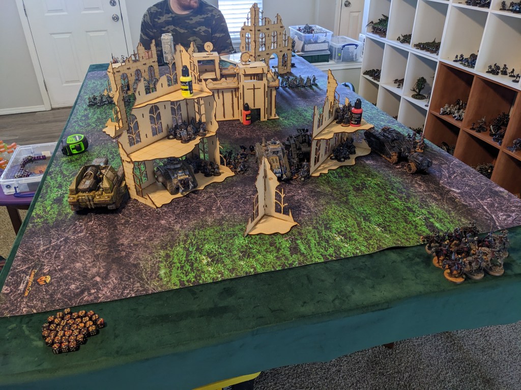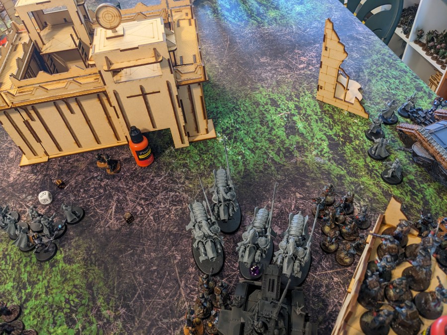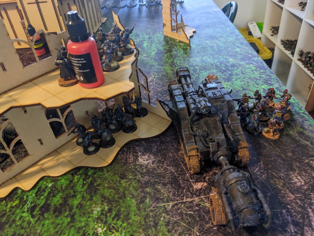 On the East Flank, he had a Malcador Infernus rolling up with two more squads of Guardsmen. The Red Objective was secured by a third squad, ready to form a second wave if needed. And it was going to be needed. A lot of guardsmen had spent all night sharpening their entrenching tools. Rumours the Space Wolves were trying to keep it relatively safe by fielding mass Stormshields was going to make this difficult. A Commissar also joined them.