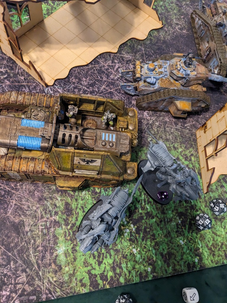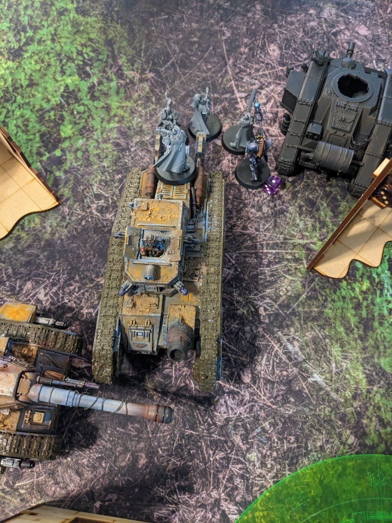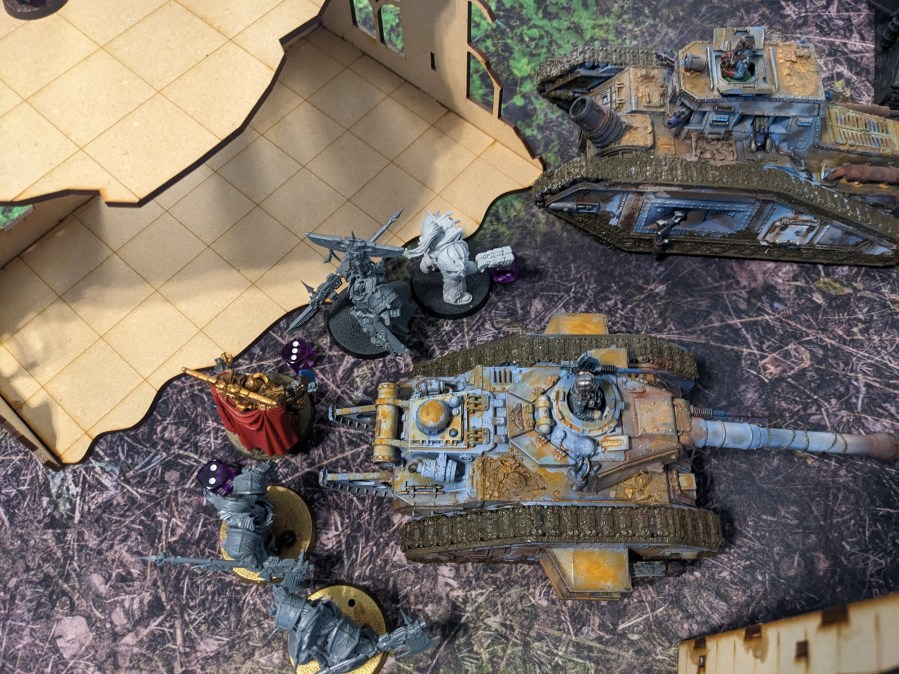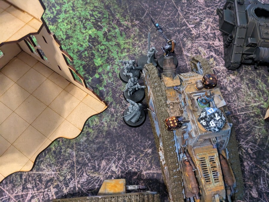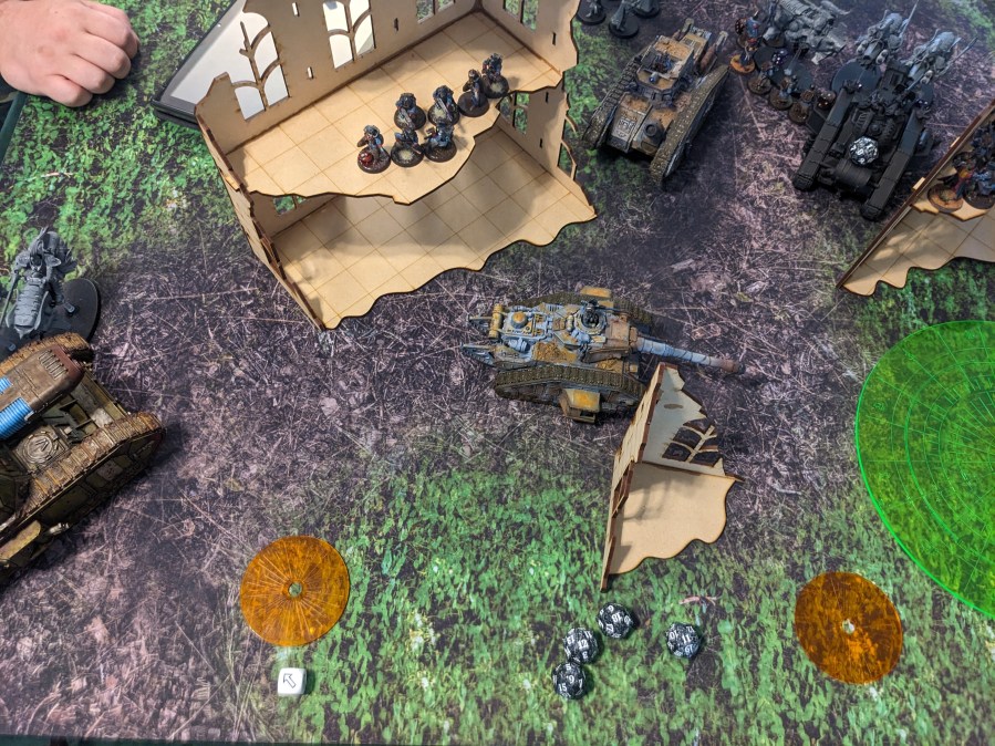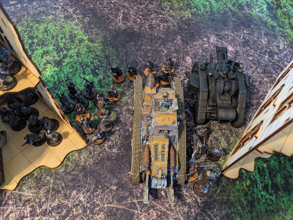 The hapless Thunderwolves continued to literally hammer at the Macharius Omega but failed to hit. This particular Krieg Battalion had either attended some extreme defensive driving courses or the Thunderhammers were broken, but it survived to continue fighting despite being flanked by marines! The excited gas masks noises from the crew cabin intensified.