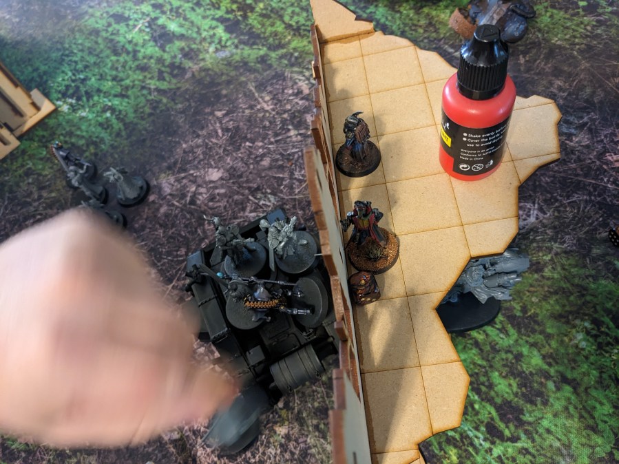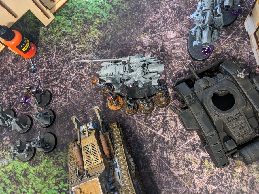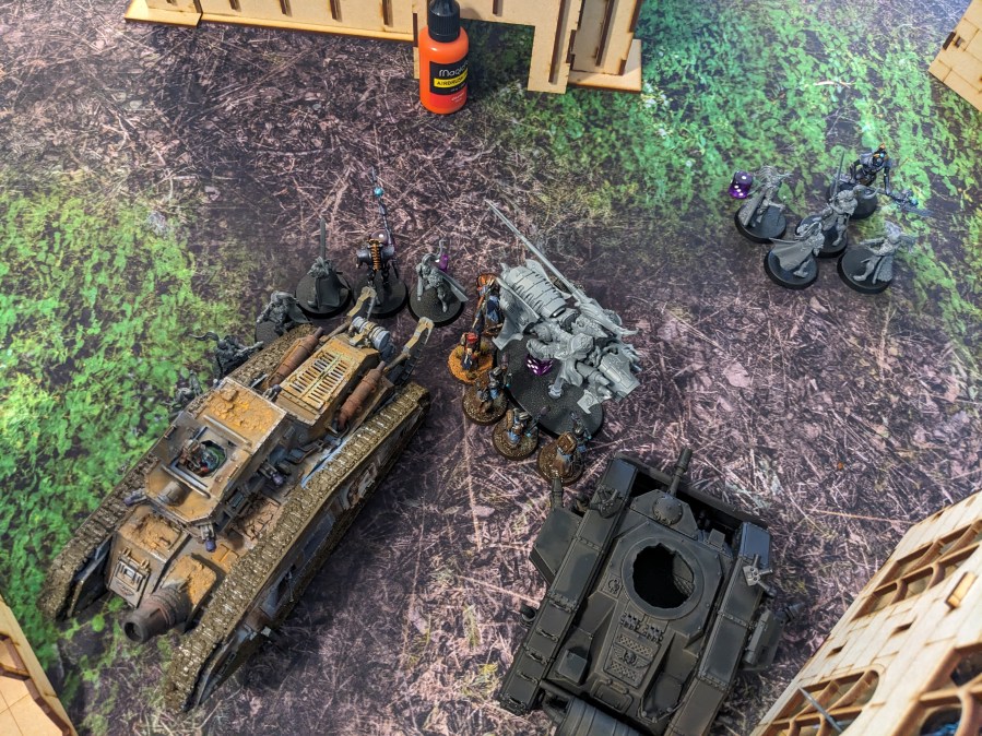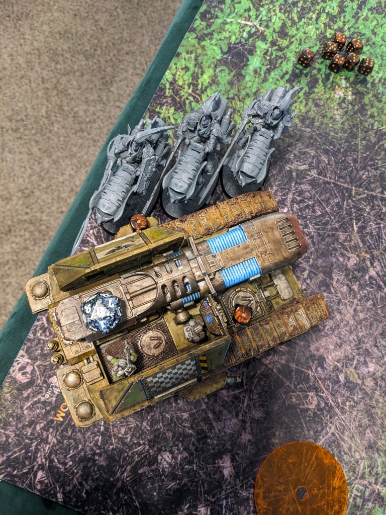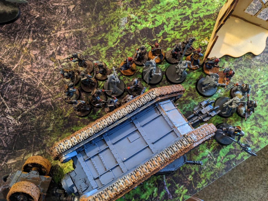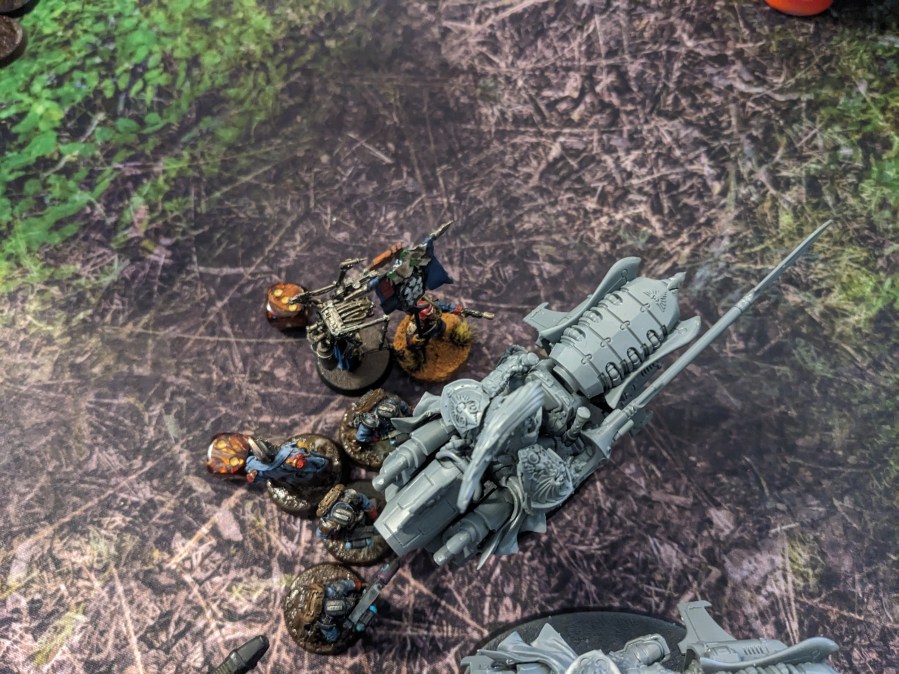 The hapless Thunderwolves continued to literally hammer at the Macharius Omega but failed to hit. This particular Krieg Battalion had either attended some extreme defensive driving courses or the Thunderhammers were broken, but it survived to continue fighting despite being flanked by marines! The excited gas masks noises from the crew cabin intensified.