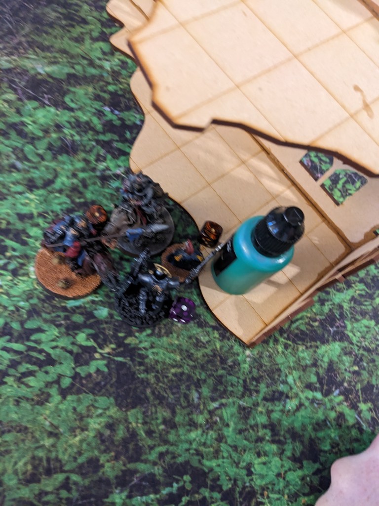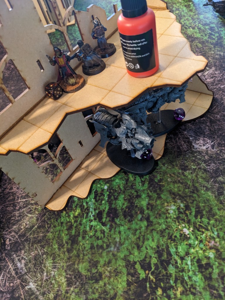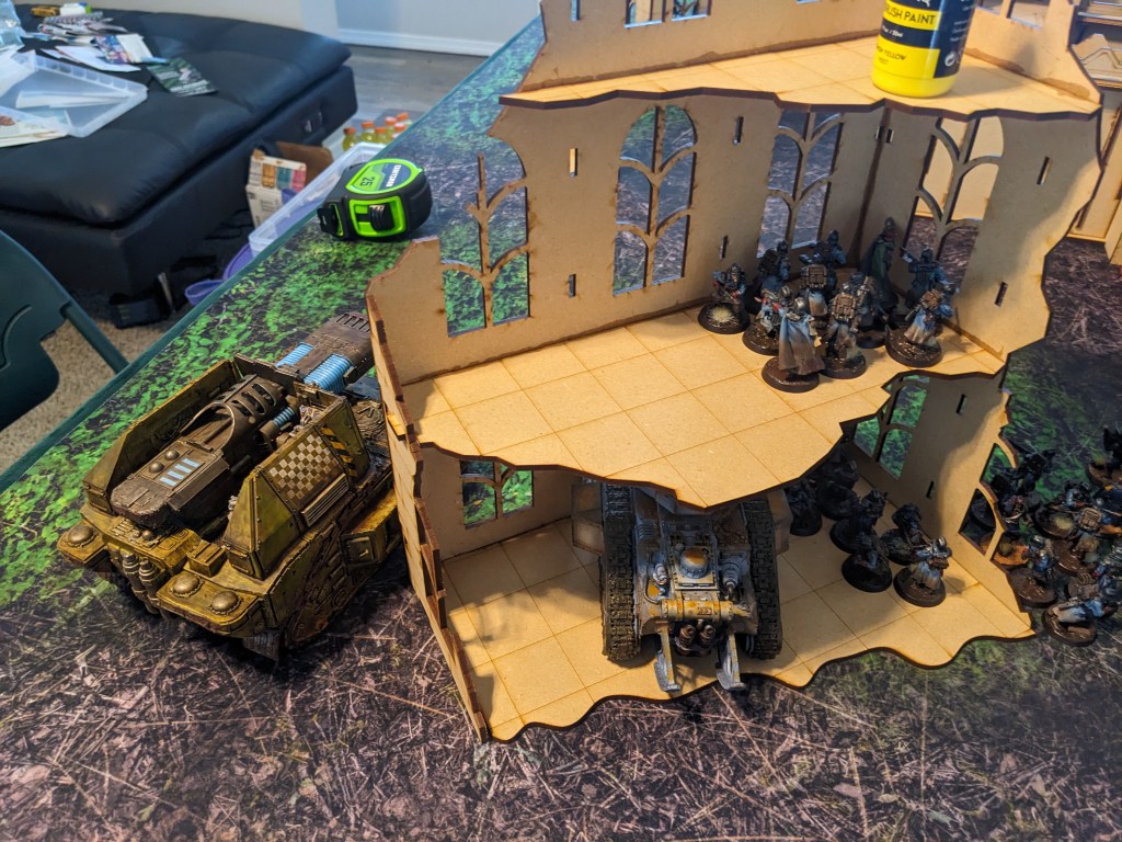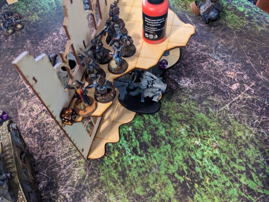 The Thunderwolves that finished off the Tank Commander moved and engaged the remainder of the second wave. Due to the difficulty of reaching the second floor, the guard were surprisingly able to boop them on the snoot with shovels and keep them at bay. The Commissar got a bit ragdolled by one but survived. Barely. Overall they nearly killed one! With yelps the wolves circled back under the floor and got ready to pounce again.