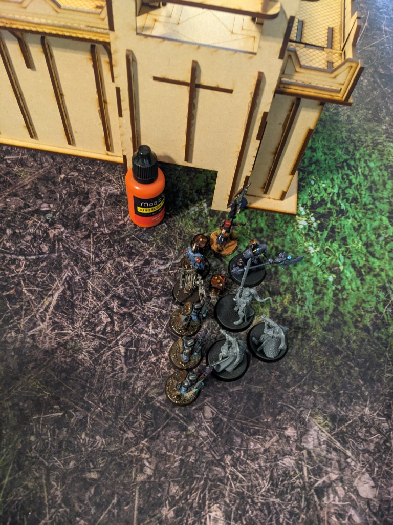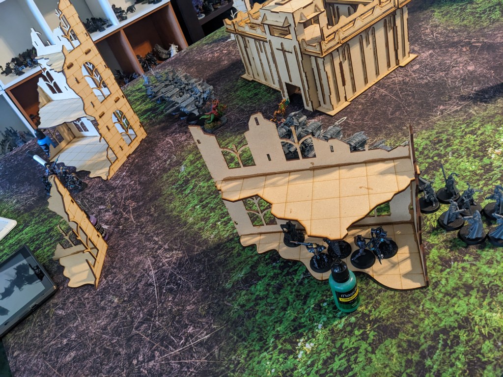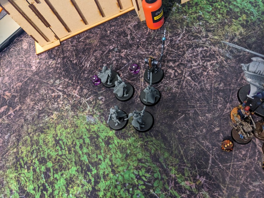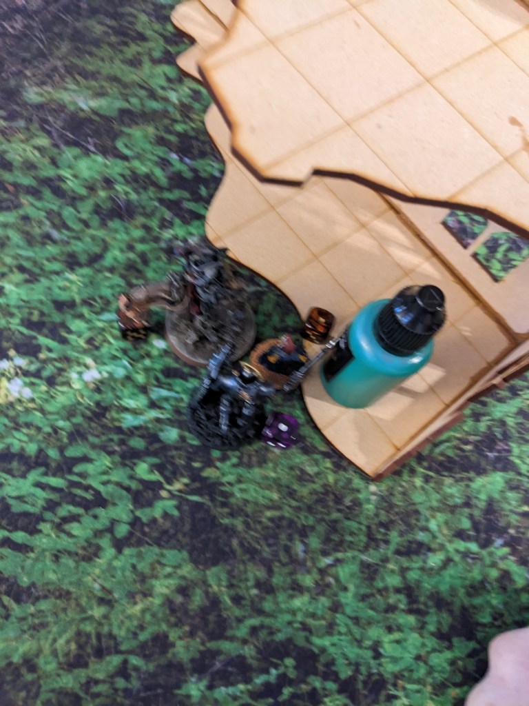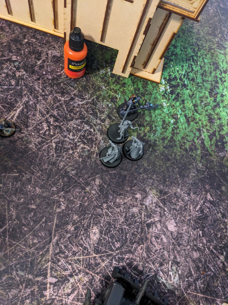 The Thunderwolves that finished off the Tank Commander moved and engaged the remainder of the second wave. Due to the difficulty of reaching the second floor, the guard were surprisingly able to boop them on the snoot with shovels and keep them at bay. The Commissar got a bit ragdolled by one but survived. Barely. Overall they nearly killed one! With yelps the wolves circled back under the floor and got ready to pounce again.