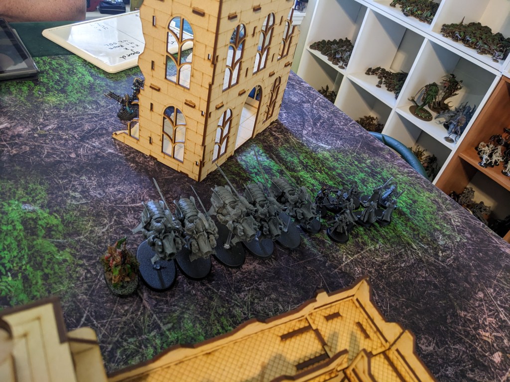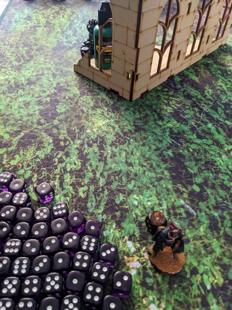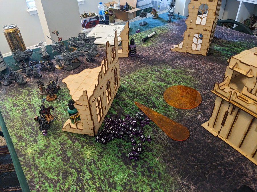 On the far reaches of the West Flank, the mighty Njal Stormcaller arrived from Reserves by Deepstriking… directly into the building due to bad intel. Someone did not take into account that Krieg fortify everything with sandbags, dirt, spare bodies, and anything else they can get their grubby little hands on. They spent their surprise arrival digging their way out of a number of unpleasant things that made up the makeshift barricade they teleported into. Unable to cast his spells, the Warlord was left vulnerable!
