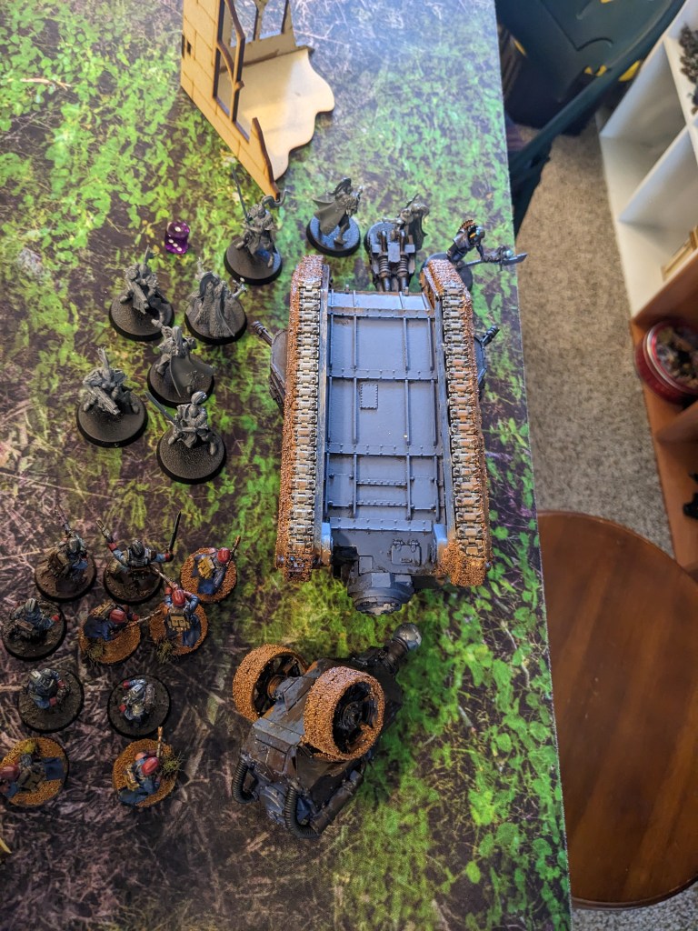 The Tank Commander continued to have his driver careen up and down the street, dodging Thunderwolves, Lightning Claws, and Thunderhammer swings. He even managed to slap one in the back of the head with a Shovel as they drove past, but the Space Wolves held their ground!