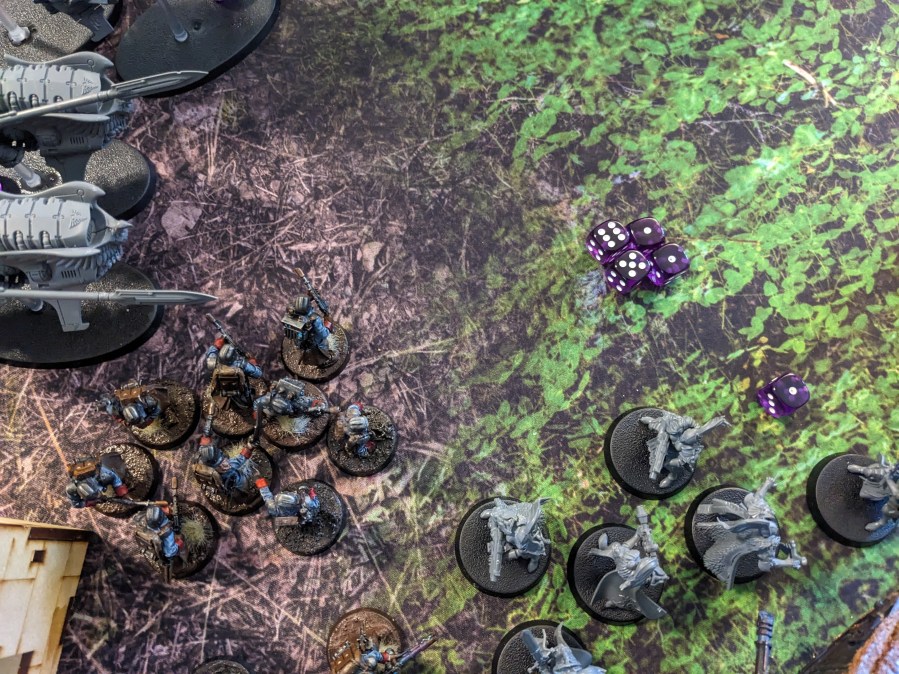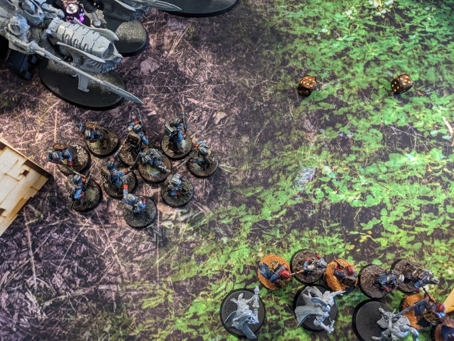 On the East Flank, the last two Guardsmen were cut down, but held the Wolfen back as long as possible so the spearhead could have the best chance of reforming and pushing!