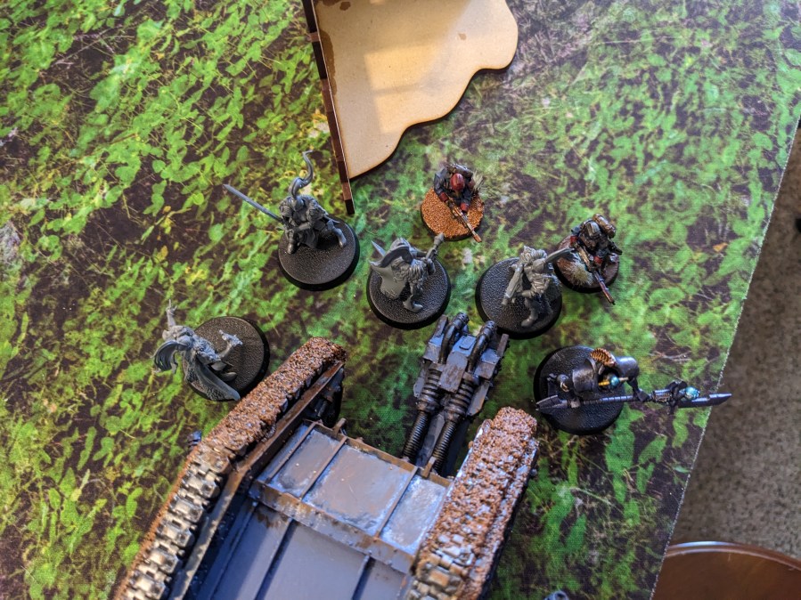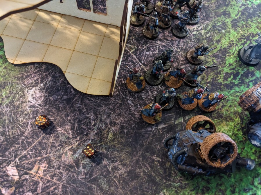 The Platoon Command Squad grimly carried on their fight, decapitating one of the Thunderwolf Marines with a shovel while the Enginseer pummeled another one in the ribs with his Servo Arm. He also found time to try and keep fixing the Tank Commander’s vent issue with his Plasma Cannons.