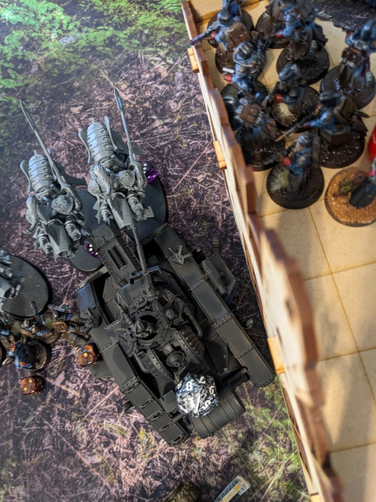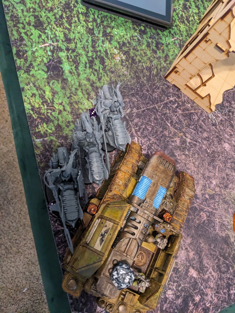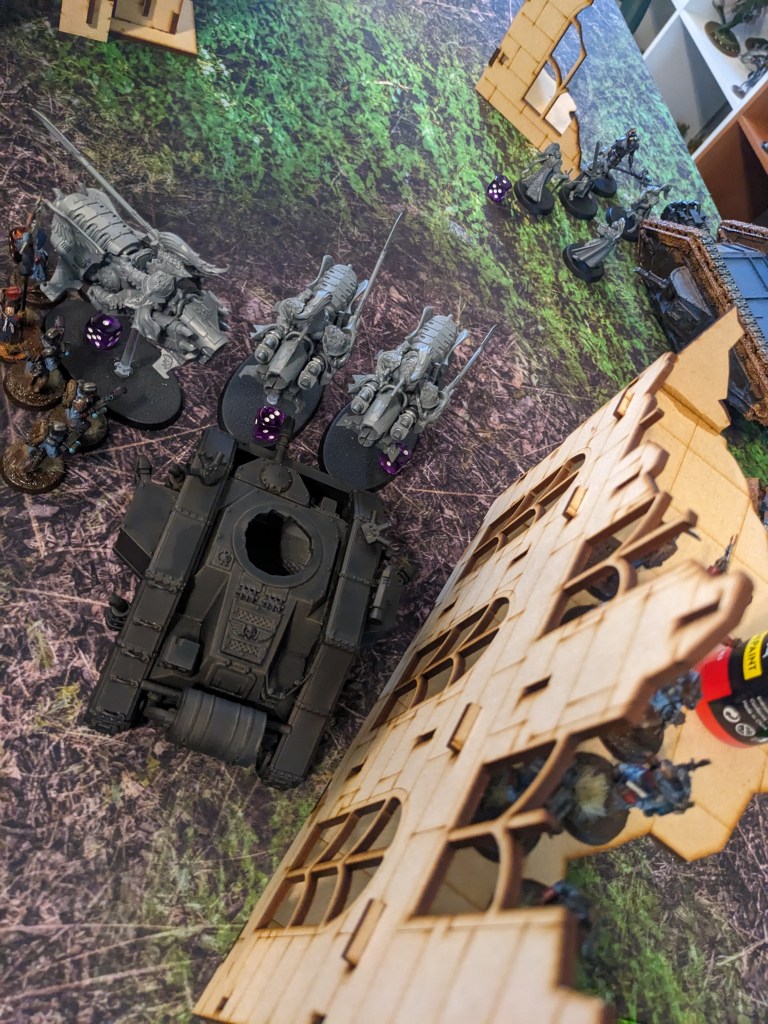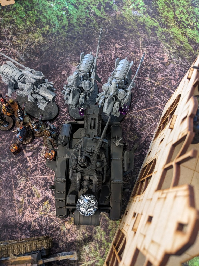 On the West Flank Thunderwolves Hit the Macharius Omega on the side! Its punishment of the Terminator squad would not go unanswered! they smashed it solidly, disabling the Heavy Bolter on the left side and forced the commander to close the hatch, removing the Heavy Stubber from the equation for a bit. It still held the line but failed to do anything in return.