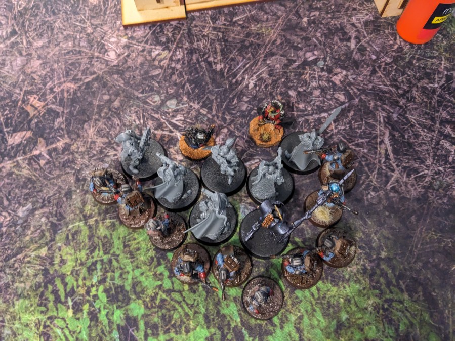 The Space Wolves took to the field quickly under the cover of darkness, using their predatory instincts to steer them straight into the Krieg lines. Both units of Thunderwolves surged forward with an immense burst of speed, ending up right in front of the Krieg as soon as the battle started!