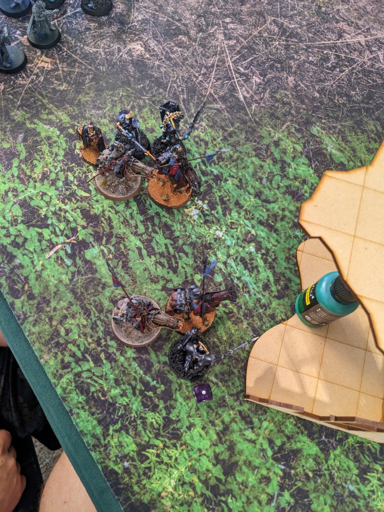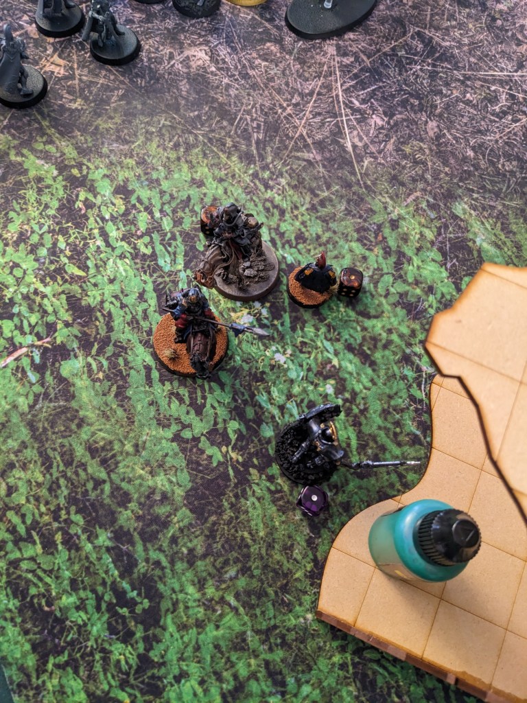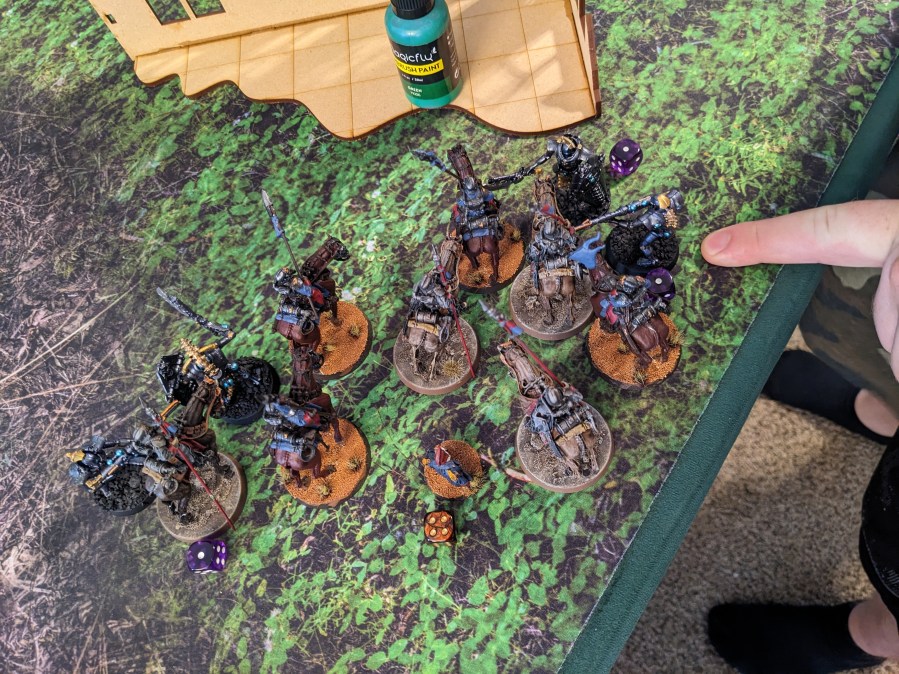 The Platoon Command Squad dueled with the last Thunderwolf. Shovels bonked, Power Swords hummed, Lightning Claws flashed like Lightning, and no one was injured as the Krieg relentlessly pushed back without giving ground.