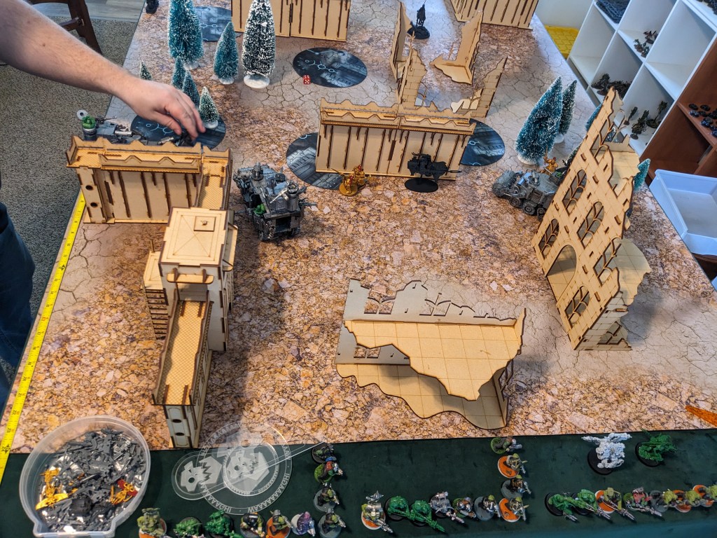 The Custodes were scattered out on key locations from their routine inspection, doubly surprised at the arrival of the Orks, Chaos, and Orks yelling something about them to “get their golden git selves into a nice spot of cover!” The Orks came roaring in on 3 Battle Wagons. Each one had been splashed in Red Paint and had their Turbos revving at full rpm. One of their drivers mistook a power pole for an Icon of Chaos bearer and killed the power grid in the abandoned warehouse, plunging the opening battle sequence into utter darkness!