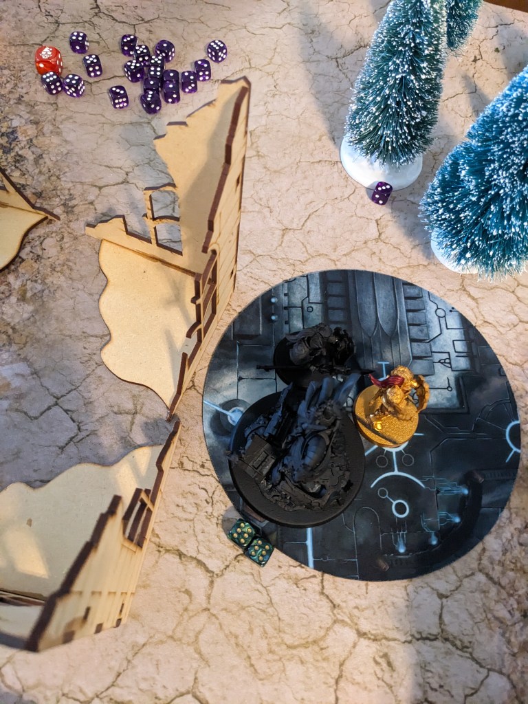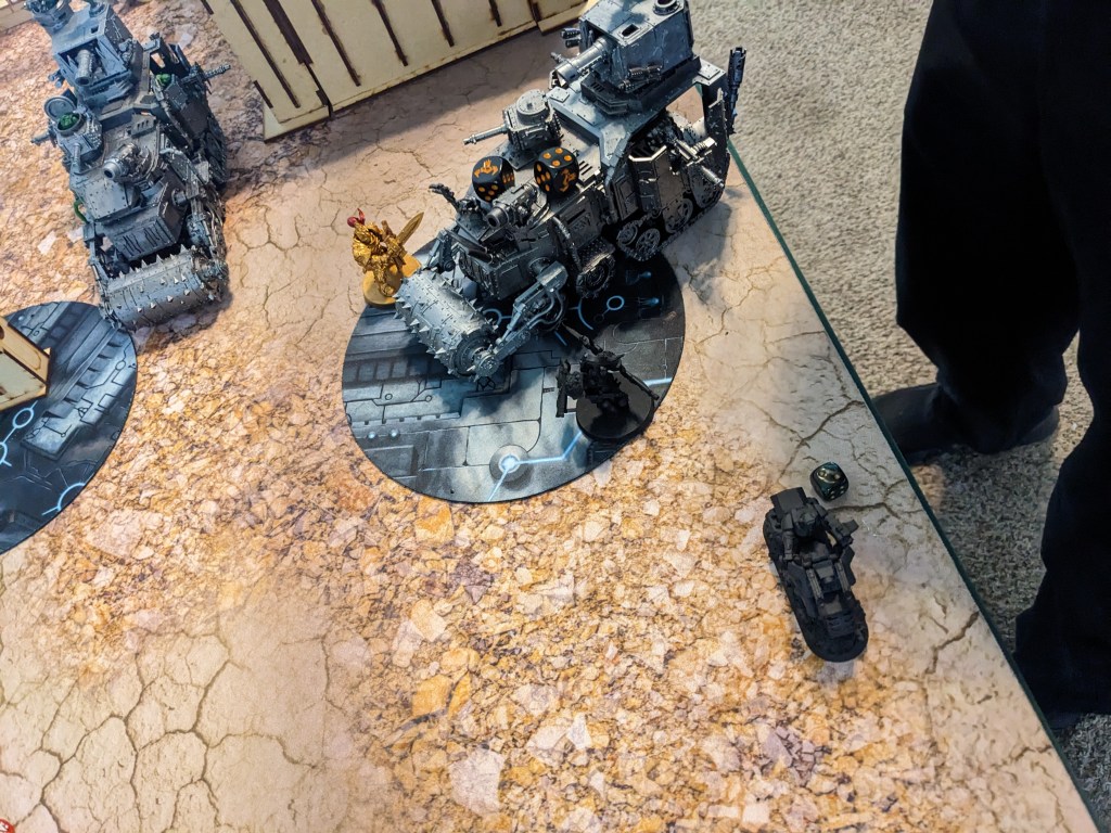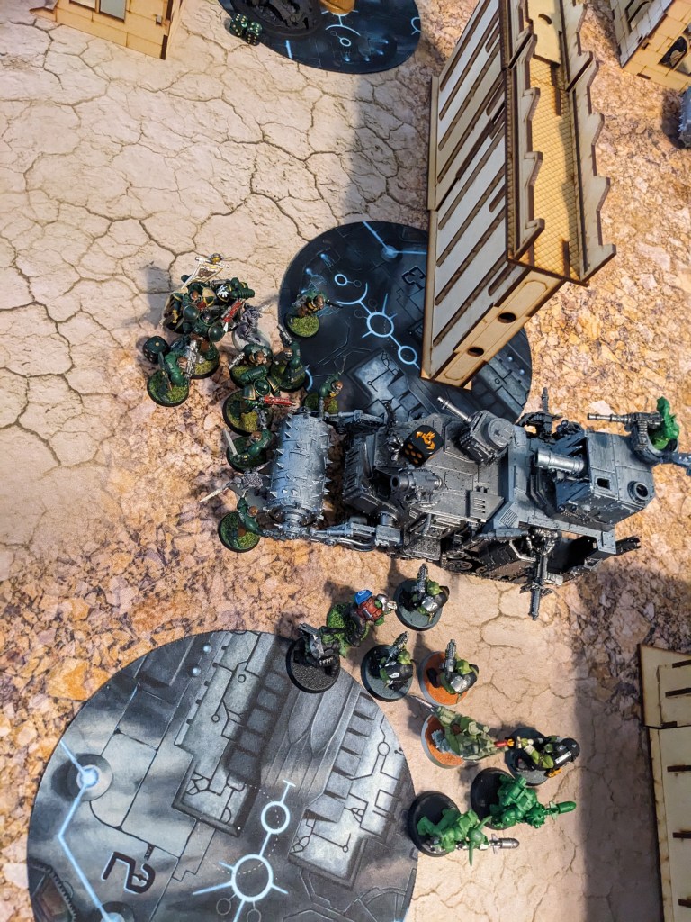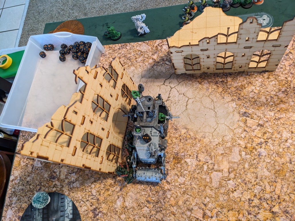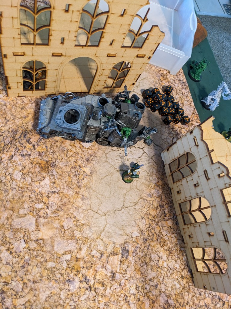With more undetonated blinking Krak Grenades clamped to it, the Battle Wagon got very lucky when the Sergeant slipped on a banana peel an Ork crew threw at him. While one very solid punch through the armour happened, the tank survived. Mostly. An ammo grot was hilariously yeeted an incredible distance. Lucius was now on page 8 of “Why Krak Grenade No Boom” and having no luck. (Seriously, like how hard is it to roll a 5+ by now?). The Battle Wagon retreated a very short distance and was easily caught.