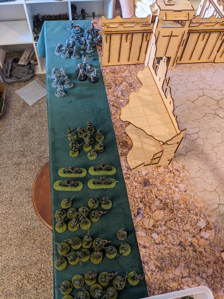 The Aberrants hit like a ton of bricks! Their initial impact killed three of the Juggernaut riders right off the bat! Their retaliation was painful, but manageable by sacrificing characters who were no longer needed like the Biophagus. The Clamavus kept Lord Invocatus locked down by shutting down his Reroll 1s To Hit Aura, which helped tremendously.